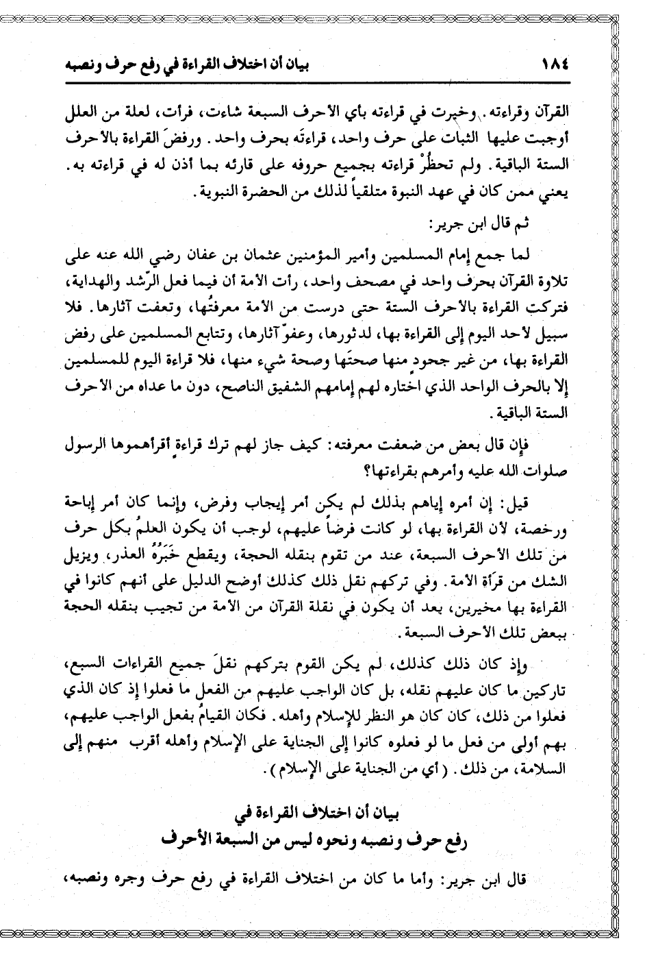 وإذ كان ذلك كذلك، لم يكن القوم بتركهم نقل جميع القراءات السبع، تاركين ما كان عليهم نقله، بل كان الواجب عليهم من الفعل ما فعلوا إذ كان الذي فعلوا من ذلك، كان كان هو النظر للإسلام وأهله. فكان القيام بفعل الواجب عليهم، بهم أولى من فعل ما لو فعلوه كانوا إلى الجناية على الإسلام وأهله أقرب منهم إلى السلامة، من ذلك. (أي من الجناية على الإسلام) .