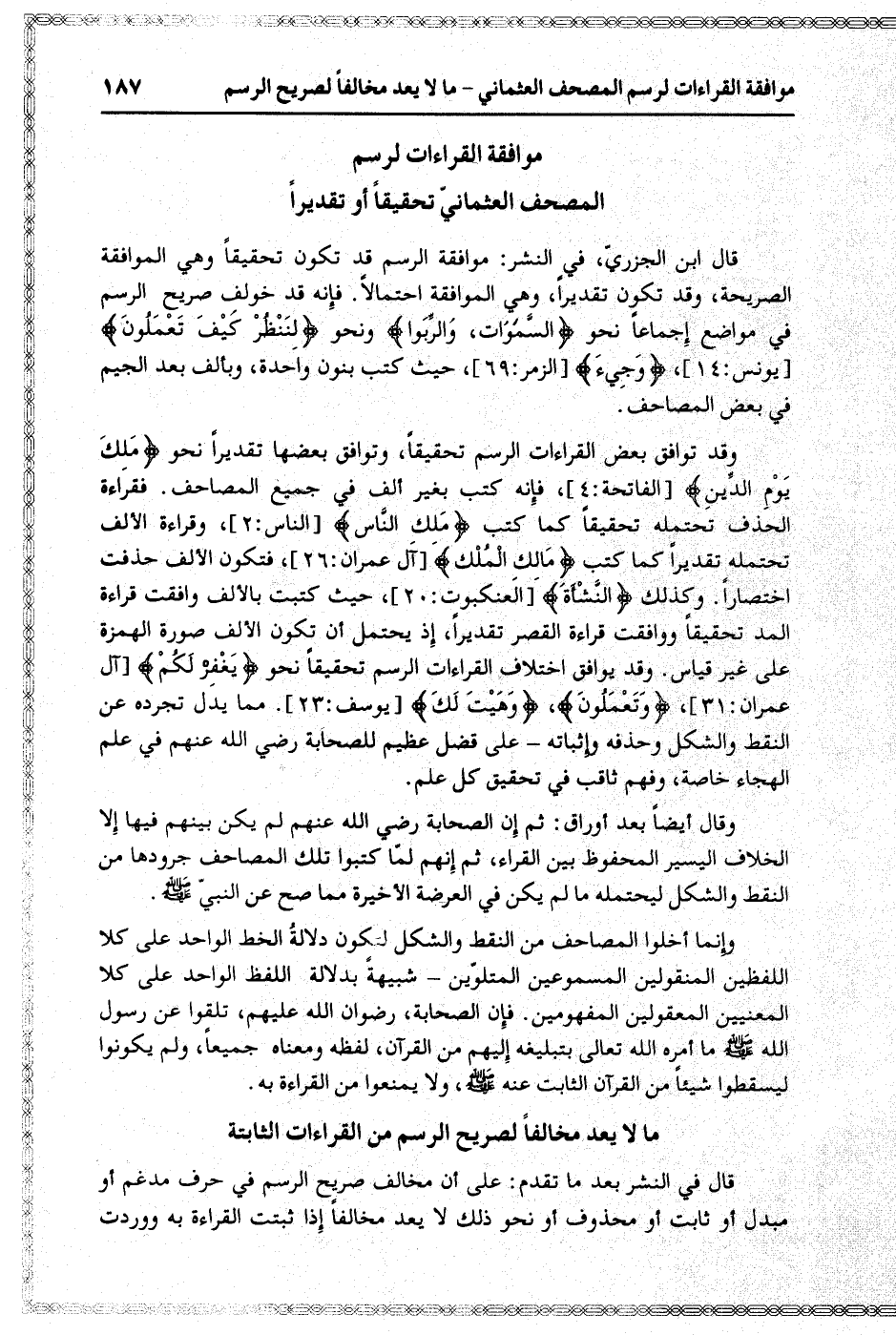 قال في النشر بعد ما تقدم: على أن مخالف صريح الرسم في حرف مدغم أو مبدل أو ثابت أو محذوف أو نحو ذلك لا يعد مخالفا إذا ثبتت القراءة به ووردت