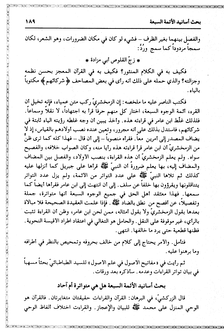 ثم رأيت في «مفاتيح الأصول في علم الأصول» للسيد الطباطبائيّ بحثا مسهبا في بيان تواتر القراءات وعدمه. سأذكره بعد ورقات.