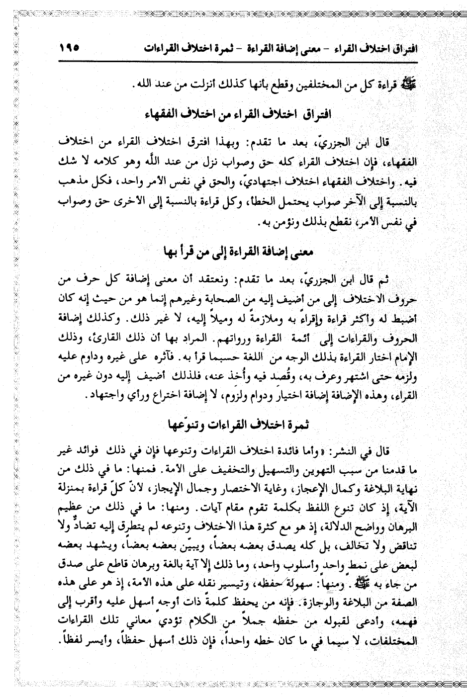 قال في النشر: «وأما فائدة اختلاف القراءات وتنوعها فإن في ذلك فوائد غير ما قدمنا من سبب التهوين والتسهيل والتخفيف على الأمة. فمنها: ما في ذلك من نهاية البلاغة وكمال الإعجاز، وغاية الاختصار وجمال الإيجاز، لأنّ كلّ قراءة بمنزلة الآية، إذ كان تنوع اللفظ بكلمة تقوم مقام آيات. ومنها: ما في ذلك من عظيم البرهان وواضح الدلالة، إذ هو مع كثرة هذا الاختلاف وتنوعه لم يتطرق إليه تضادّ ولا تناقض ولا تخالف، بل كله يصدق بعضه بعضا، ويبيّن بعضه بعضا، ويشهد بعضه لبعض على نمط واحد وأسلوب واحد، وما ذلك إلا آية بالغة وبرهان قاطع على صدق من جاء به صلّى الله عليه وسلّم. ومنها: سهولة حفظه، وتيسير نقله على هذه الأمة، إذ هو على هذه الصفة من البلاغة والوجازة. فإنه من يحفظ كلمة ذات أوجه أسهل عليه وأقرب إلى فهمه، وأدعى لقبوله من حفظه جملا من الكلام تؤدّي معاني تلك القراءات المختلفات، لا سيما في ما كان خطه واحدا، فإن ذلك أسهل حفظا، وأيسر لفظا.