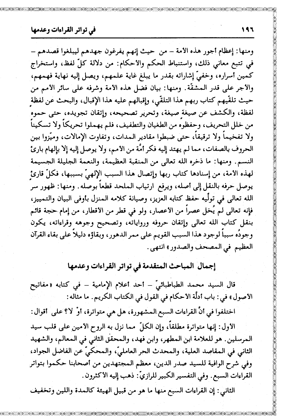 قال السيد محمد الطباطبائيّ- أحد أعلام الإمامية- في كتابه «مفاتيح الأصول» في: باب أدلّة الأحكام في القول في الكتاب الكريم. ما مثاله: