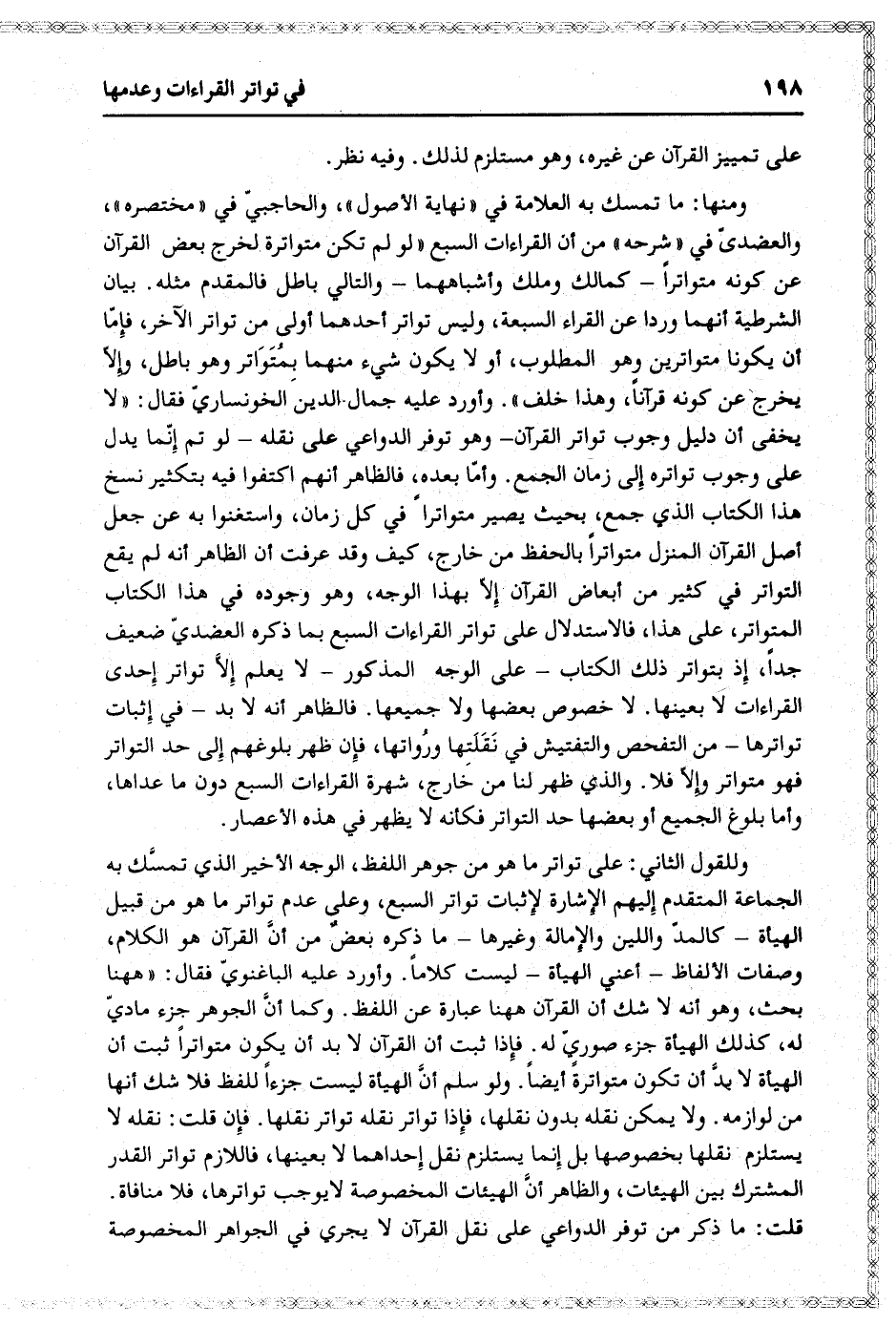 وللقول الثاني: على تواتر ما هو من جوهر اللفظ، الوجه الأخير الذي تمسّك به الجماعة المتقدم إليهم الإشارة لإثبات تواتر السبع، وعلى عدم تواتر ما هو من قبيل الهيأة- كالمدّ واللين والإمالة وغيرها- ما ذكره بعض من أنّ القرآن هو الكلام، وصفات الألفاظ- أعني الهيأة- ليست كلاما. وأورد عليه الباغنويّ فقال: «هاهنا بحث، وهو أنه لا شك أن القرآن هاهنا عبارة عن اللفظ. وكما أنّ الجوهر جزء ماديّ له، كذلك الهيأة جزء صوريّ له. فإذا ثبت أن القرآن لا بد أن يكون متواترا ثبت أن الهيأة لا بدّ أن تكون متواترة أيضا. ولو سلم أنّ الهيأة ليست جزءا للفظ فلا شك أنها من لوازمه. ولا يمكن نقله بدون نقلها، فإذا تواتر نقله تواتر نقلها. فإن قلت: نقله لا يستلزم نقلها بخصوصها بل إنما يستلزم نقل إحداهما لا بعينها، فاللازم تواتر القدر المشترك بين الهيئات، والظاهر أنّ الهيئات المخصوصة لا يوجب تواترها، فلا منافاة.