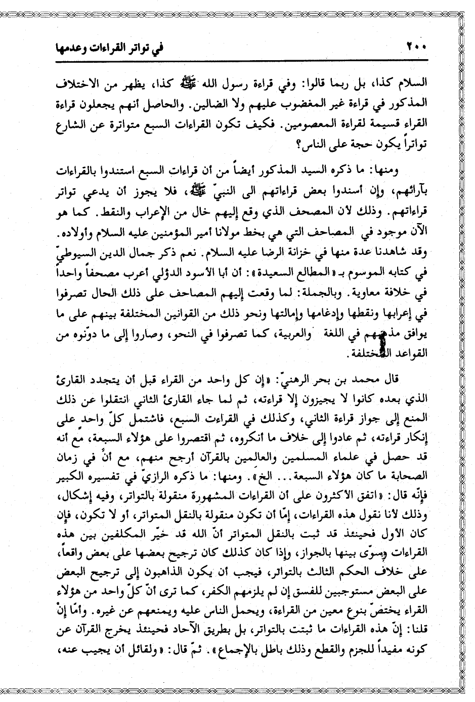 ومنها: ما ذكره السيد المذكور أيضا من أن قراءات السبع استندوا بالقراءات بآرائهم، وإن أسندوا بعض قراءاتهم الى النبيّ صلّى الله عليه وسلّم، فلا يجوز أن يدعي تواتر قراءاتهم. وذلك لأن المصحف الذي وقع إليهم خال من الإعراب والنقط. كما هو الآن موجود في المصاحف التي هي بخط مولانا أمير المؤمنين عليه السلام وأولاده.