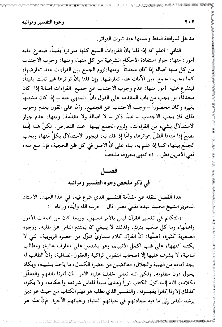 هذا الفصل ننقله عن مقدّمة التفسير الذي شرع فيه، في هذا العهد، الأستاذ النحرير الشيخ محمد عبده مفتي مصر. قال- حرسه الله وأيّده ورعاه-: