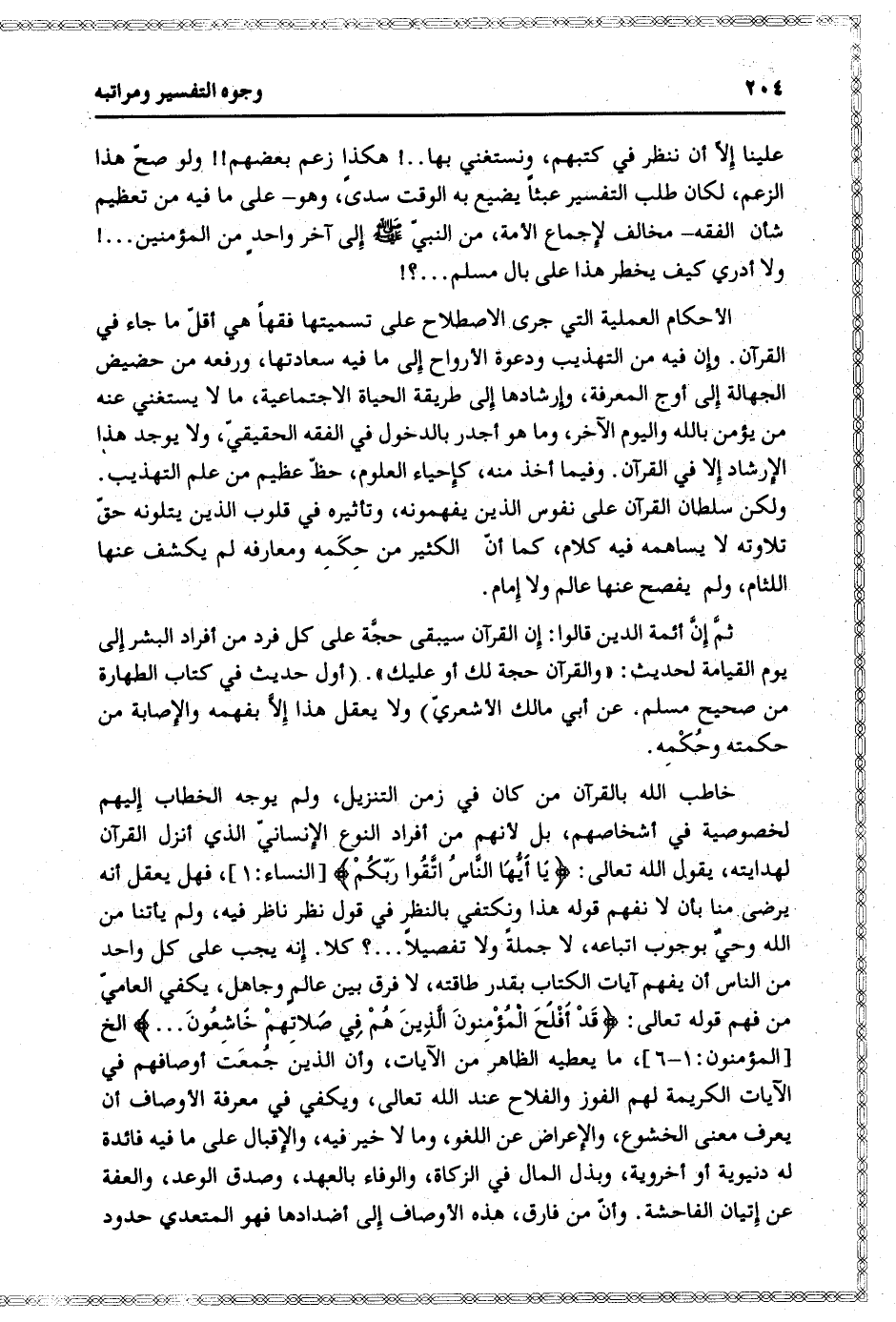 خاطب الله بالقرآن من كان في زمن التنزيل، ولم يوجه الخطاب إليهم لخصوصية في أشخاصهم، بل لأنهم من أفراد النوع الإنسانيّ الذي أنزل القرآن لهدايته، يقول الله تعالى: يا أَيُّهَا النَّاسُ اتَّقُوا رَبَّكُمُ [النساء: 1] ، فهل يعقل أنه يرضى منا بأن لا نفهم قوله هذا ونكتفي بالنظر في قول نظر ناظر فيه، ولم يأتنا من الله وحي بوجوب اتباعه، لا جملة ولا تفصيلا ... ؟ كلا. إنه يجب على كل واحد من الناس أن يفهم آيات الكتاب بقدر طاقته، لا فرق بين عالم وجاهل، يكفي العاميّ من فهم قوله تعالى: قَدْ أَفْلَحَ الْمُؤْمِنُونَ الَّذِينَ هُمْ فِي صَلاتِهِمْ خاشِعُونَ ... إلخ [المؤمنون: 1- 6] ، ما يعطيه الظاهر من الآيات، وأن الذين جمعت أوصافهم في الآيات الكريمة لهم الفوز والفلاح عند الله تعالى، ويكفي في معرفة الأوصاف أن يعرف معنى الخشوع، والإعراض عن اللغو، وما لا خير فيه، والإقبال على ما فيه فائدة له دنيوية أو أخروية، وبذل المال في الزكاة، والوفاء بالعهد، وصدق الوعد، والعفة عن إتيان الفاحشة. وأنّ من فارق، هذه الأوصاف إلى أضدادها فهو المتعدي حدود