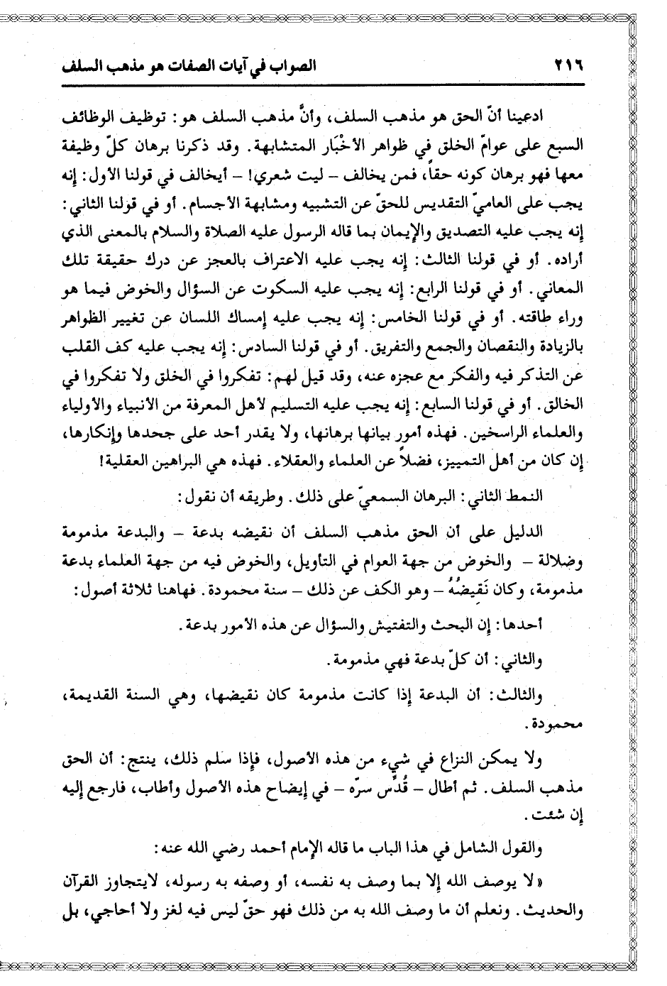 إنه يجب عليه التصديق والإيمان بما قاله الرسول عليه الصلاة والسلام بالمعنى الذي أراده. أو في قولنا الثالث: إنه يجب عليه الاعتراف بالعجز عن درك حقيقة تلك المعاني. أو في قولنا الرابع: إنه يجب عليه السكوت عن السؤال والخوض فيما هو وراء طاقته. أو في قولنا الخامس: إنه يجب عليه إمساك اللسان عن تغيير الظواهر بالزيادة والنقصان والجمع والتفريق. أو في قولنا السادس: إنه يجب عليه كف القلب عن التذكر فيه والفكر مع عجزه عنه، وقد قيل لهم: تفكروا في الخلق ولا تفكروا في الخالق. أو في قولنا السابع: إنه يجب عليه التسليم لأهل المعرفة من الأنبياء والأولياء والعلماء الراسخين. فهذه أمور بيانها برهانها، ولا يقدر أحد على جحدها وإنكارها، إن كان من أهل التمييز، فضلا عن العلماء والعقلاء. فهذه هي البراهين العقلية! النمط الثاني: البرهان السمعيّ على ذلك. وطريقه أن نقول: