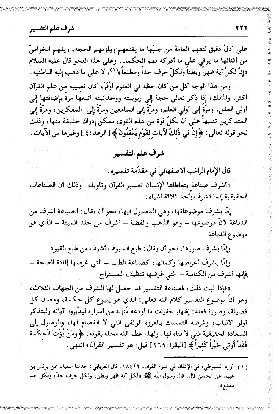 «أشرف صناعة يتعاطاها الإنسان تفسير القرآن وتأويله. وذلك أن الصناعات الحقيقية إنما تشرف بأحد ثلاثة أشياء: