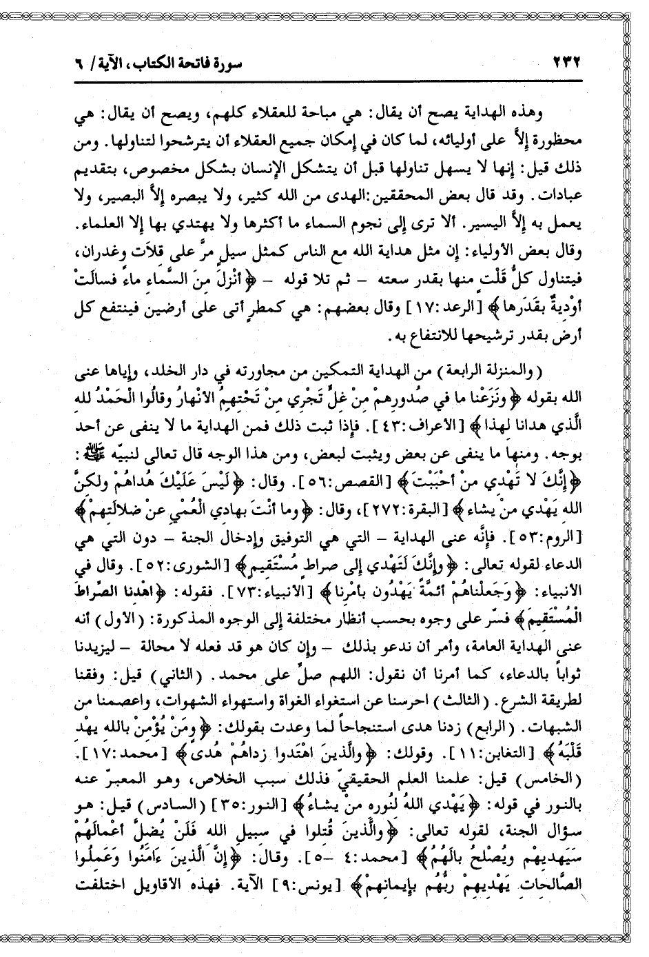 (الخامس) قيل: علمنا العلم الحقيقيّ فذلك سبب الخلاص، وهو المعبّر عنه بالنور في قوله: يَهْدِي اللَّهُ لِنُورِهِ مَنْ يَشاءُ [النور: 35] (السادس) قيل: هو سؤال الجنة، لقوله تعالى: وَالَّذِينَ قُتِلُوا فِي سَبِيلِ اللَّهِ فَلَنْ يُضِلَّ أَعْمالَهُمْ سَيَهْدِيهِمْ وَيُصْلِحُ بالَهُمْ [محمد: 4- 5] . وقال: إِنَّ الَّذِينَ آمَنُوا وَعَمِلُوا الصَّالِحاتِ يَهْدِيهِمْ رَبُّهُمْ بِإِيمانِهِمْ [يونس: 9] الآية. فهذه الأقاويل اختلفت