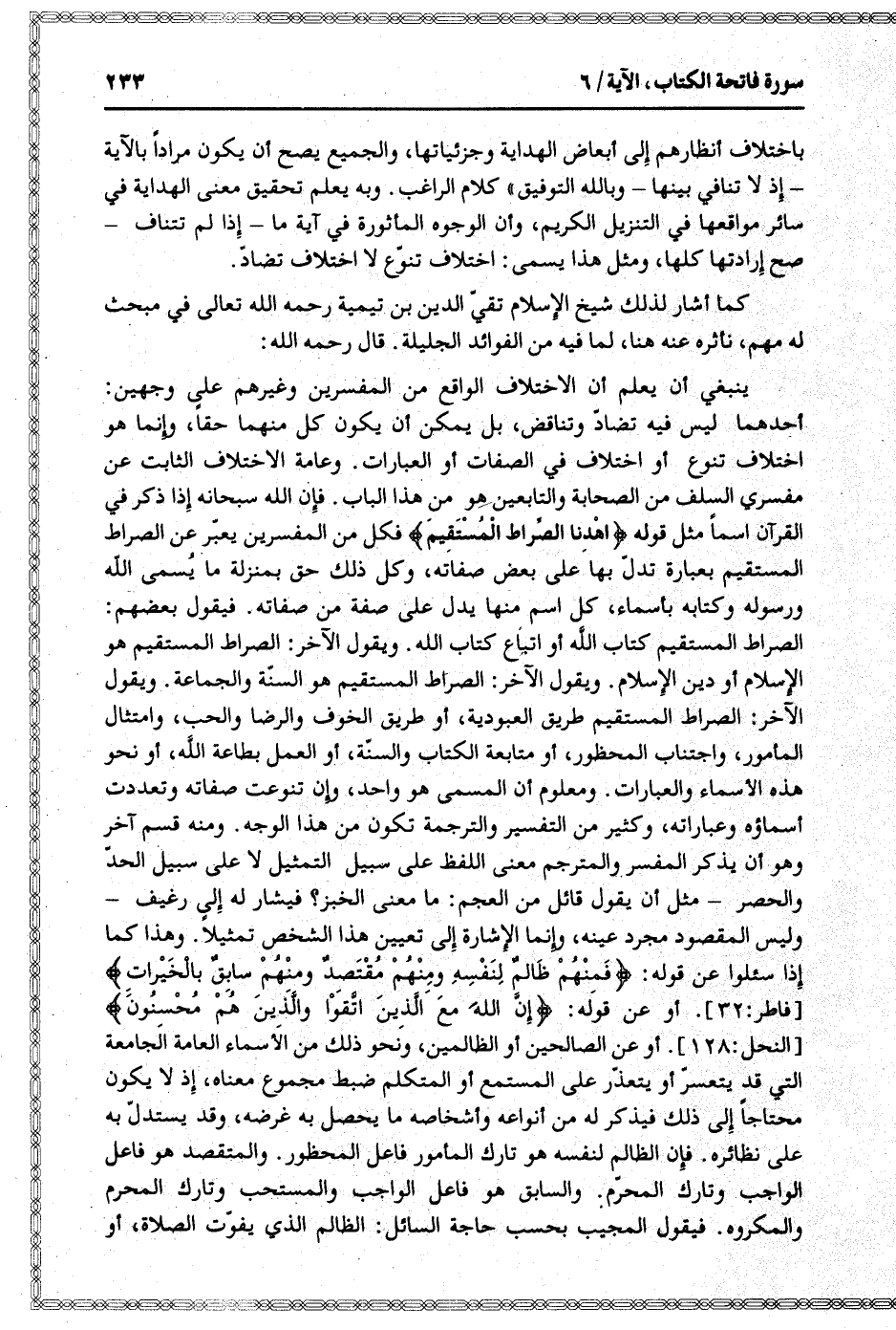 الصراط المستقيم كتاب الله أو اتباع كتاب الله. ويقول الآخر: الصراط المستقيم هو الإسلام أو دين الإسلام. ويقول الآخر: الصراط المستقيم هو السنّة والجماعة. ويقول الآخر: الصراط المستقيم طريق العبودية، أو طريق الخوف والرضا والحب، وامتثال المأمور، واجتناب المحظور، أو متابعة الكتاب والسنّة، أو العمل بطاعة الله، أو نحو هذه الأسماء والعبارات. ومعلوم أن المسمى هو واحد، وإن تنوعت صفاته وتعددت أسماؤه وعباراته، وكثير من التفسير والترجمة تكون من هذا الوجه. ومنه قسم آخر وهو أن يذكر المفسر والمترجم معنى اللفظ على سبيل التمثيل لا على سبيل الحدّ والحصر- مثل أن يقول قائل من العجم: ما معنى الخبز؟ فيشار له إلى رغيف- وليس المقصود مجرد عينه، وإنما الإشارة إلى تعيين هذا الشخص تمثيلا. وهذا كما إذا سئلوا عن قوله: فَمِنْهُمْ ظالِمٌ لِنَفْسِهِ وَمِنْهُمْ مُقْتَصِدٌ وَمِنْهُمْ سابِقٌ بِالْخَيْراتِ [فاطر: 32] . أو عن قوله: إِنَّ اللَّهَ مَعَ الَّذِينَ اتَّقَوْا وَالَّذِينَ هُمْ مُحْسِنُونَ [النحل: 128] . أو عن الصالحين أو الظالمين، ونحو ذلك من الأسماء العامة الجامعة التي قد يتعسّر أو يتعذّر على المستمع أو المتكلم ضبط مجموع معناه، إذ لا يكون محتاجا إلى ذلك فيذكر له من أنواعه وأشخاصه ما يحصل به غرضه، وقد يستدلّ به على نظائره. فإن الظالم لنفسه هو تارك المأمور فاعل المحظور. والمقتصد هو فاعل الواجب وتارك المحرّم. والسابق هو فاعل الواجب والمستحب وتارك المحرم والمكروه. فيقول المجيب بحسب حاجة السائل: الظالم الذي يفوّت الصلاة، أو