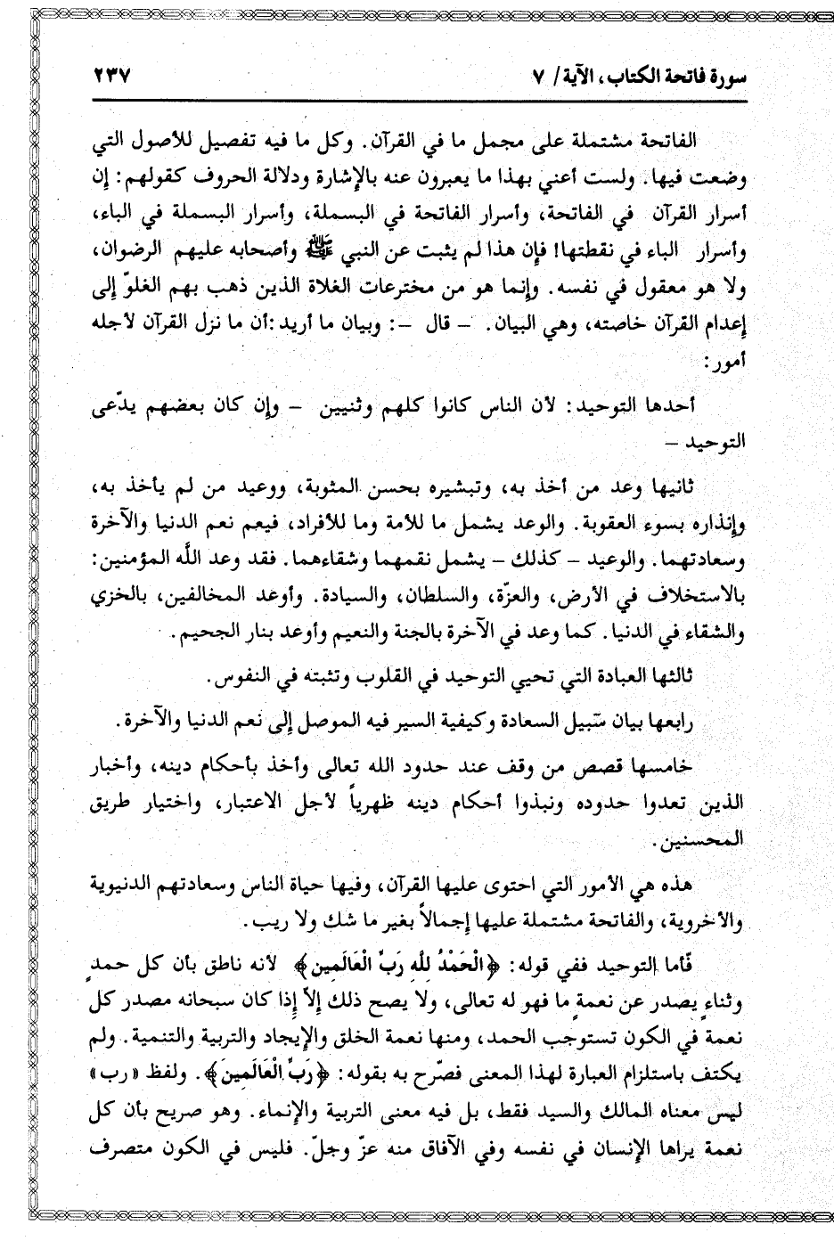 الفاتحة مشتملة على مجمل ما في القرآن. وكل ما فيه تفصيل للأصول التي وضعت فيها. ولست أعني بهذا ما يعبرون عنه بالإشارة ودلالة الحروف كقولهم: إن أسرار القرآن في الفاتحة، وأسرار الفاتحة في البسملة، وأسرار البسملة في الباء، وأسرار الباء في نقطتها! فإن هذا لم يثبت عن النبي صلى الله عليه وسلّم وأصحابه عليهم الرضوان، ولا هو معقول في نفسه. وإنما هو من مخترعات الغلاة الذين ذهب بهم الغلوّ إلى إعدام القرآن خاصته، وهي البيان. - قال-: وبيان ما أريد: أن ما نزل القرآن لأجله أمور:
