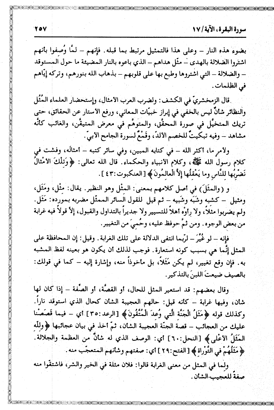 قال الزمخشريّ في الكشف: ولضرب العرب الأمثال، واستحضار العلماء المثل والنظائر شأن ليس بالخفي في إبراز خبيّات المعاني، ورفع الأستار عن الحقائق، حتى تريك المتخيّل في صورة المحقّق، والمتوهّم في معرض المتيقّن، والغائب كأنّه مشاهد- وفيه تبكيت للخصم الألدّ، وقمع لسورة الجامح الأبيّ.