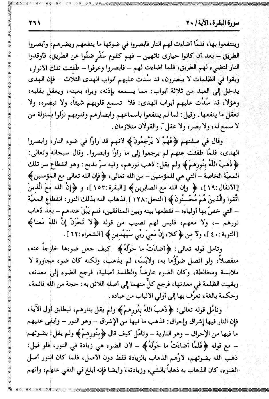وتأمّل قوله تعالى: ذَهَبَ اللَّهُ بِنُورِهِمْ ولم يقل بنارهم، ليطابق أول الآية، فإن النار فيها إشراق وإحراق: فذهب ما فيها من الإشراق- وهو النور- وأبقى عليهم ما فيها من الإحراق- وهو النارية- وتأمّل كيف قال بِنُورِهِمْ ولم يقل: بضوئهم- مع قوله فَلَمَّا أَضاءَتْ ما حَوْلَهُ- لأن الضوء هي زيادة في النور، فلو قيل: