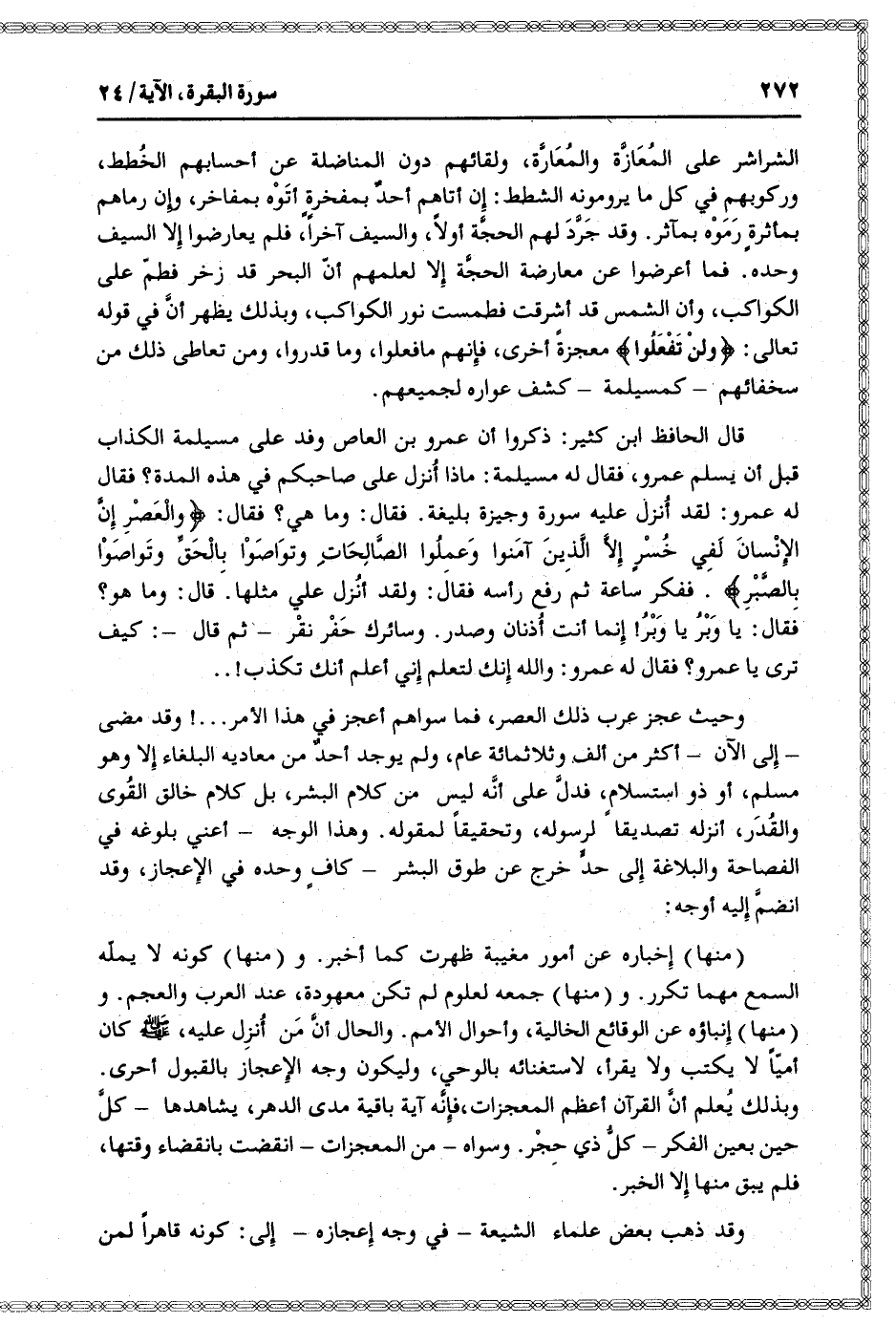 قال الحافظ ابن كثير: ذكروا أن عمرو بن العاص وفد على مسيلمة الكذاب قبل أن يسلم عمرو، فقال له مسيلمة: ماذا أنزل على صاحبكم في هذه المدة؟ فقال له عمرو: لقد أنزل عليه سورة وجيزة بليغة. فقال: وما هي؟ فقال: وَالْعَصْرِ إِنَّ الْإِنْسانَ لَفِي خُسْرٍ إِلَّا الَّذِينَ آمَنُوا وَعَمِلُوا الصَّالِحاتِ وَتَواصَوْا بِالْحَقِّ وَتَواصَوْا بِالصَّبْرِ. ففكر ساعة ثم رفع رأسه فقال: ولقد أنزل علي مثلها. قال: وما هو؟