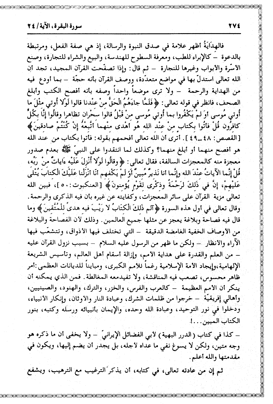وقال تعالى في أول هذه السورة الم ذلِكَ الْكِتابُ لا رَيْبَ فِيهِ هُدىً لِلْمُتَّقِينَ وما قال فيه فصاحة وبلاغة يعجز عن مثلها جميع العالمين. وذلك لأن الفصاحة والبلاغة من الأوصاف الخفية الغامضة الدقيقة- التي تختلف فيها الأذواق، وتتشعّب فيها الآراء والأنظار- ولكن ما ظهر من الرسول عليه السلام- بسبب نزول القرآن عليه- من العلم والقدرة على هداية الأمم، وإزالة أسقام أهل العالم، وتأسيس الشريعة الإلهامية، وإيجاد الأمة الإسلامية رغما للأمم الكبرى، ومباينا للديانات العظمى: أمر ظاهر محسوس، تصعب فيه المناقشة، ولا تفيد معه المغالطة. فمن الذي يمكنه أن ينكر أن الأمم العظيمة- كالعرب والفرس، والخزر، والترك، والهنود، والصينيين، وأهالي إفريقيّة- خرجوا من ظلمات الشرك، وعبادة النار والأوثان، وإنكار الأنبياء، ودخلوا في نور التوحيد، وعبادة الله وحده، والإيمان بأنبيائه ورسله وكتبه، بنور الكتاب المبين ... !