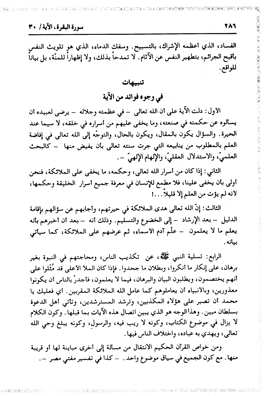 الثالث: إنّ الله تعالى هدى الملائكة في حيرتهم، وأجابهم عن سؤالهم بإقامة الدليل- بعد الإرشاد- إلى الخضوع والتسليم. وذلك أنه- بعد أن أخبرهم بأنه يعلم ما لا يعلمون- علّم آدم الأسماء، ثم عرضهم على الملائكة، كما سيأتي بيانه.