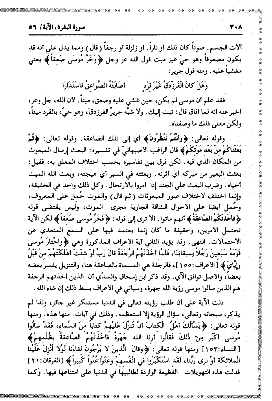 بعثت البعير من مبركه أي أثرته. وبعثته في السير أي هيجته، وبعث الله الميت أحياه. وضرب البعث على الجند إذا أمروا بالارتحال. وكل ذلك واحد في الحقيقة، وإنما اختلف لاختلاف صور المبعوثات (ثم قال) والموت حمل على المعروف، وحمل أيضا على الأحوال الشاقة الجارية مجرى الموت، وليس يقتضى قوله فَأَخَذَتْكُمُ الصَّاعِقَةُ أنهم ماتوا. ألا ترى إلى قوله: وَخَرَّ مُوسى صَعِقاً لكن الآية تحتمل الأمرين، وحقيقة ما كان إنما يعتمد فيها على السمع المتعدي عن الاحتمالات. انتهى. وقد يؤيد الثاني آية الأعراف المذكورة وهي وَاخْتارَ مُوسى قَوْمَهُ سَبْعِينَ رَجُلًا لِمِيقاتِنا، فَلَمَّا أَخَذَتْهُمُ الرَّجْفَةُ قالَ رَبِّ لَوْ شِئْتَ أَهْلَكْتَهُمْ مِنْ قَبْلُ وَإِيَّايَ [الأعراف: 155] ، فالرجفة هي المسماة بالصاعقة هنا، والتنزيل يفسر بعضه بعضا، والأصل توافق الآي. وقد ذكر ابن إسحاق والسدّي أن الذين أخذتهم الرجفة هم الذين سألوا موسى رؤية الله جهرة، وسيأتي في الأعراف بسط ذلك إن شاء الله.