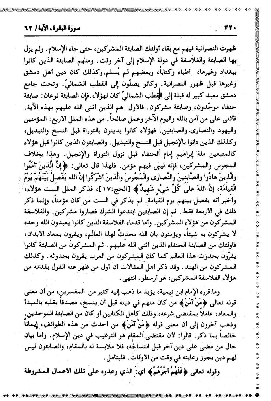 وما قرره الإمام ابن تيمية، يؤيد ما ذهب إليه كثير من المفسرين، من أن معنى قوله تعالى مَنْ آمَنَ من كان منهم في دينه قبل أن ينسخ، مصدقا بقلبه بالمبدأ والمعاد، عاملا بمقتضى شرعه، وذلك كأهل الكتابين أو كان من الصابئة الموحدين.