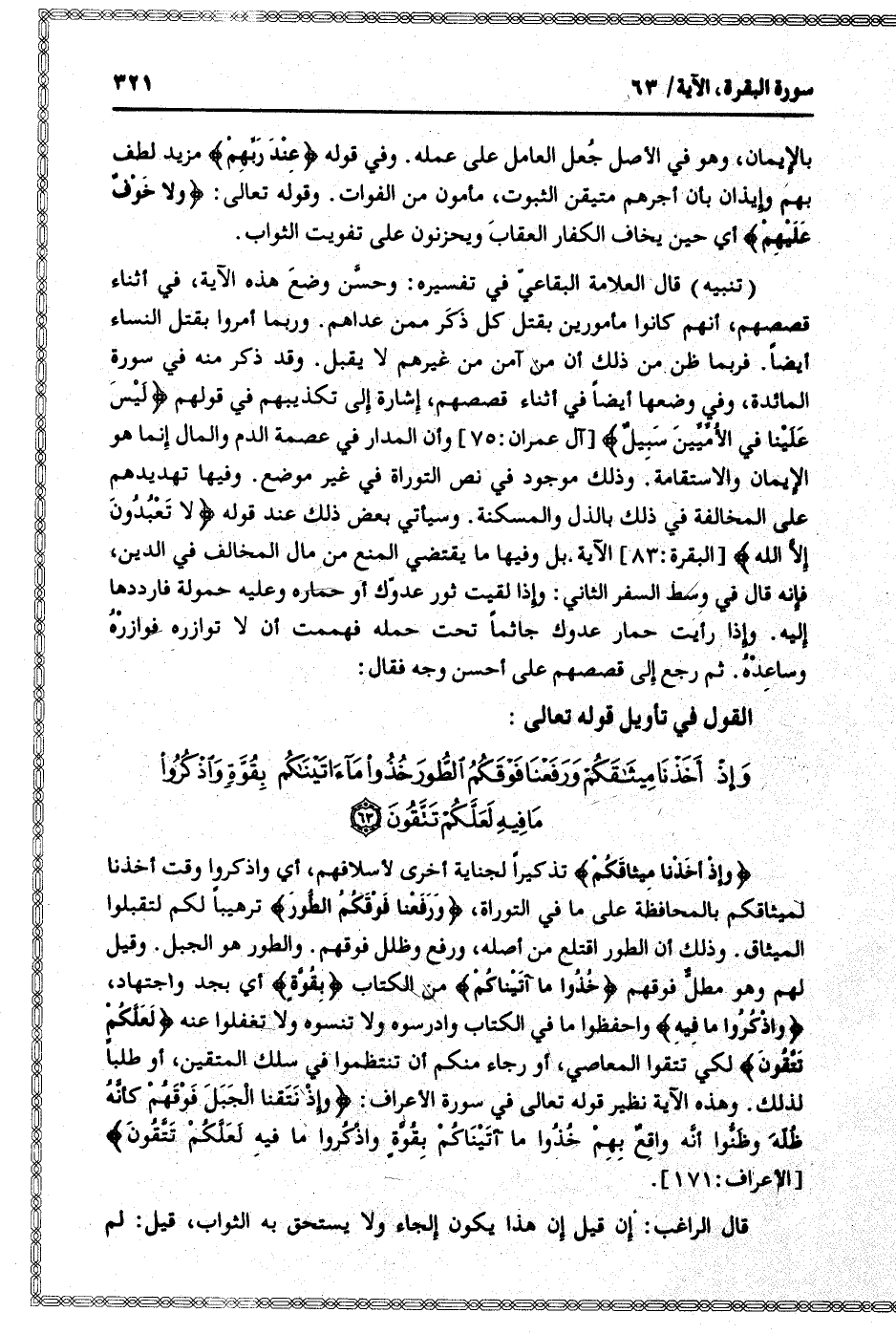 وَإِذْ أَخَذْنا مِيثاقَكُمْ تذكيرا لجناية أخرى لأسلافهم، أي واذكروا وقت أخذنا لميثاقكم بالمحافظة على ما في التوراة، وَرَفَعْنا فَوْقَكُمُ الطُّورَ ترهيبا لكم لتقبلوا الميثاق. وذلك أن الطور اقتلع من أصله، ورفع وظلل فوقهم. والطور هو الجبل. وقيل لهم وهو مطلّ فوقهم خُذُوا ما آتَيْناكُمْ من الكتاب بِقُوَّةٍ أي بجد واجتهاد، وَاذْكُرُوا ما فِيهِ واحفظوا ما في الكتاب وادرسوه ولا تنسوه ولا تغفلوا عنه لَعَلَّكُمْ تَتَّقُونَ لكي تتقوا المعاصي، أو رجاء منكم أن تنتظموا في سلك المتقين، أو طلبا لذلك. وهذه الآية نظير قوله تعالى في سورة الأعراف: وَإِذْ نَتَقْنَا الْجَبَلَ فَوْقَهُمْ كَأَنَّهُ ظُلَّةٌ وَظَنُّوا أَنَّهُ واقِعٌ بِهِمْ خُذُوا ما آتَيْناكُمْ بِقُوَّةٍ وَاذْكُرُوا ما فِيهِ لَعَلَّكُمْ تَتَّقُونَ [الأعراف: 171] .