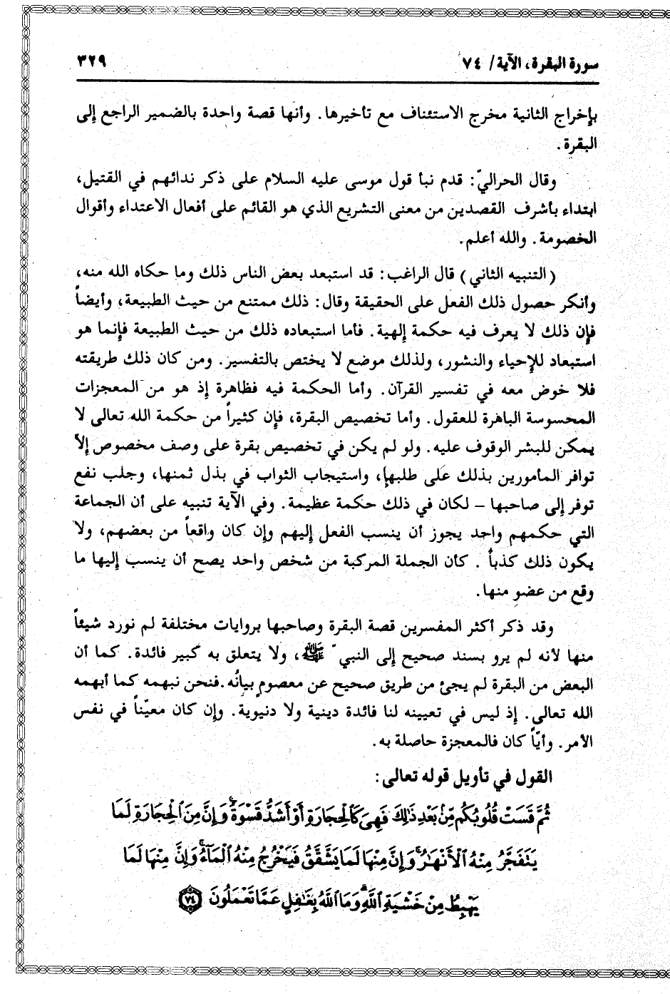(التنبيه الثاني) قال الراغب: قد استبعد بعض الناس ذلك وما حكاه الله منه، وأنكر حصول ذلك الفعل على الحقيقة وقال: ذلك ممتنع من حيث الطبيعة، وأيضا فإن ذلك لا يعرف فيه حكمة إلهية. فأما استبعاده ذلك من حيث الطبيعة فإنما هو استبعاد للإحياء والنشور، ولذلك موضع لا يختص بالتفسير. ومن كان ذلك طريقته فلا خوض معه في تفسير القرآن. وأما الحكمة فيه فظاهرة إذ هو من المعجزات المحسوسة الباهرة للعقول. وأما تخصيص البقرة، فإن كثيرا من حكمة الله تعالى لا يمكن للبشر الوقوف عليه. ولو لم يكن في تخصيص بقرة على وصف مخصوص إلّا توافر المأمورين بذلك على طلبها، واستيجاب الثواب في بذل ثمنها، وجلب نفع توفر إلى صاحبها- لكان في ذلك حكمة عظيمة. وفي الآية تنبيه على أن الجماعة التي حكمهم واحد يجوز أن ينسب الفعل إليهم وإن كان واقعا من بعضهم، ولا يكون ذلك كذبا. كأن الجملة المركبة من شخص واحد يصح أن ينسب إليها ما وقع من عضو منها.
