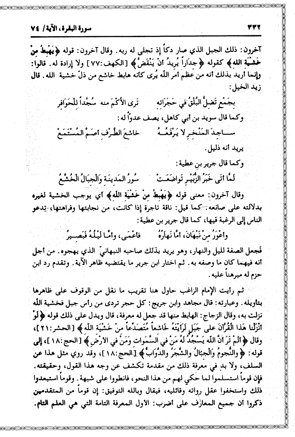 ثم رأيت الإمام الراغب حاول هنا تقريب ما نقل من الوقوف على ظاهرها بتأويله. وعبارته: قال مجاهد وابن جريج: كل حجر تردى من رأس جبل فخشية الله نزلت به، وقال الزجاج: الهابط منها قد جعل له معرفة، قال ويدل على ذلك قوله لَوْ أَنْزَلْنا هذَا الْقُرْآنَ عَلى جَبَلٍ لَرَأَيْتَهُ خاشِعاً مُتَصَدِّعاً مِنْ خَشْيَةِ اللَّهِ [الحشر: 21] ، وقال أَلَمْ تَرَ أَنَّ اللَّهَ يَسْجُدُ لَهُ مَنْ فِي السَّماواتِ وَمَنْ فِي الْأَرْضِ [الحج: 18] ، إلى قوله: وَالنُّجُومُ وَالْجِبالُ وَالشَّجَرُ وَالدَّوَابُّ [الحج: 18] ، وقد روي مثل هذا عن السلف، ولا بد في معرفة ذلك من مقدمة تكشف عن وجه هذا القول، وحقيقته.