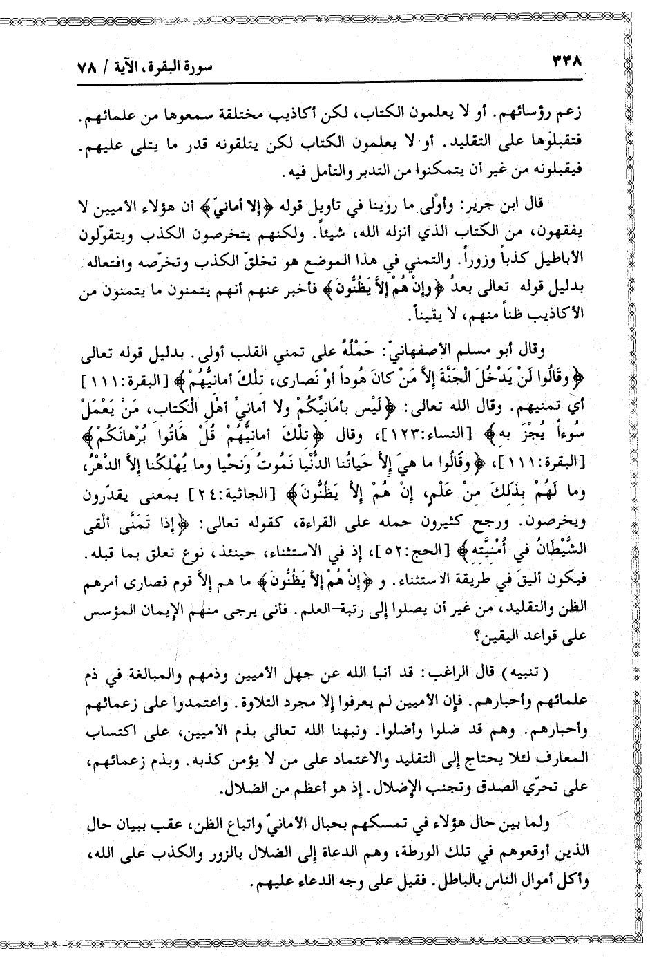قال ابن جرير: وأولى ما روينا في تأويل قوله إِلَّا أَمانِيَّ أن هؤلاء الأميين لا يفقهون، من الكتاب الذي أنزله الله، شيئا. ولكنهم يتخرصون الكذب ويتقوّلون الأباطيل كذبا وزورا. والتمني في هذا الموضع هو تخلّق الكذب وتخرّصه وافتعاله.
