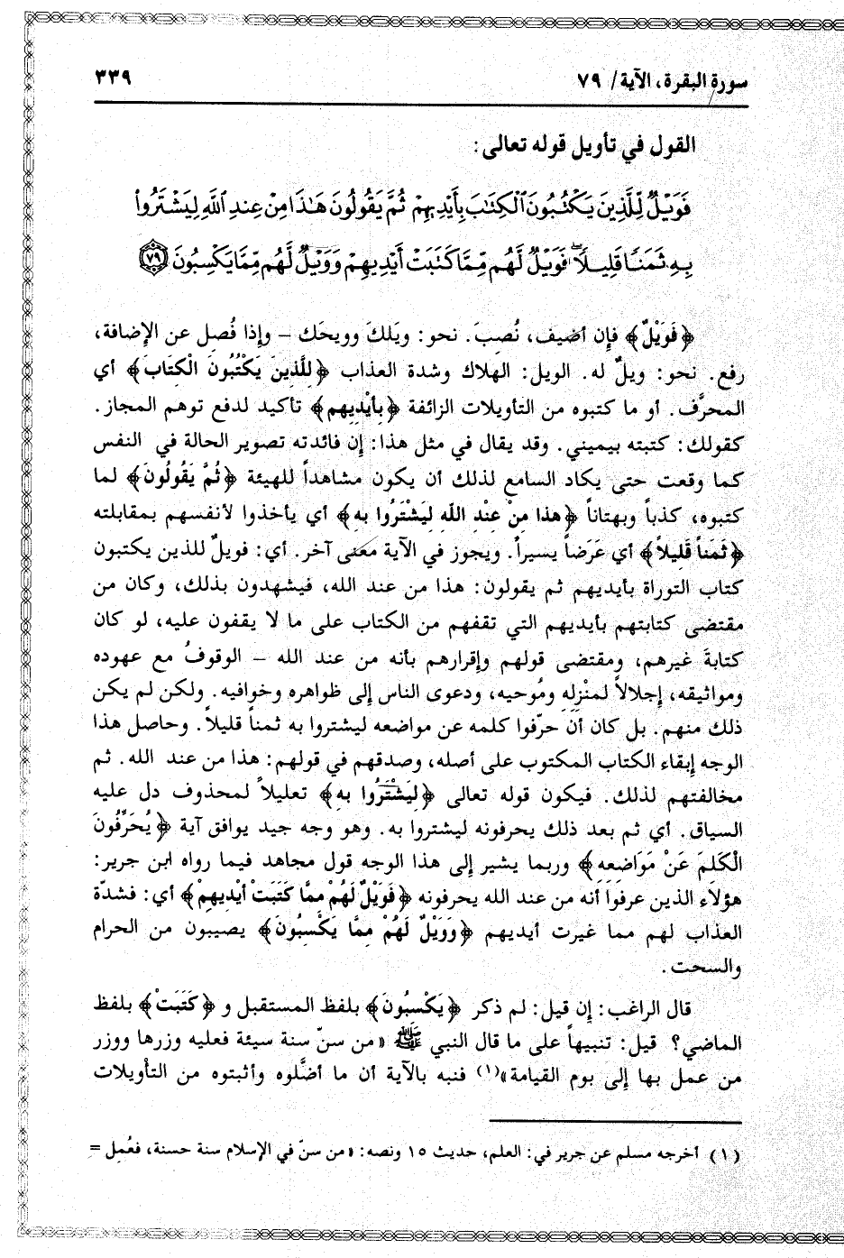 فَوَيْلٌ لِلَّذِينَ يَكْتُبُونَ الْكِتابَ بِأَيْدِيهِمْ ثُمَّ يَقُولُونَ هذا مِنْ عِنْدِ اللَّهِ لِيَشْتَرُوا بِهِ ثَمَناً قَلِيلاً فَوَيْلٌ لَهُمْ مِمَّا كَتَبَتْ أَيْدِيهِمْ وَوَيْلٌ لَهُمْ مِمَّا يَكْسِبُونَ (79)