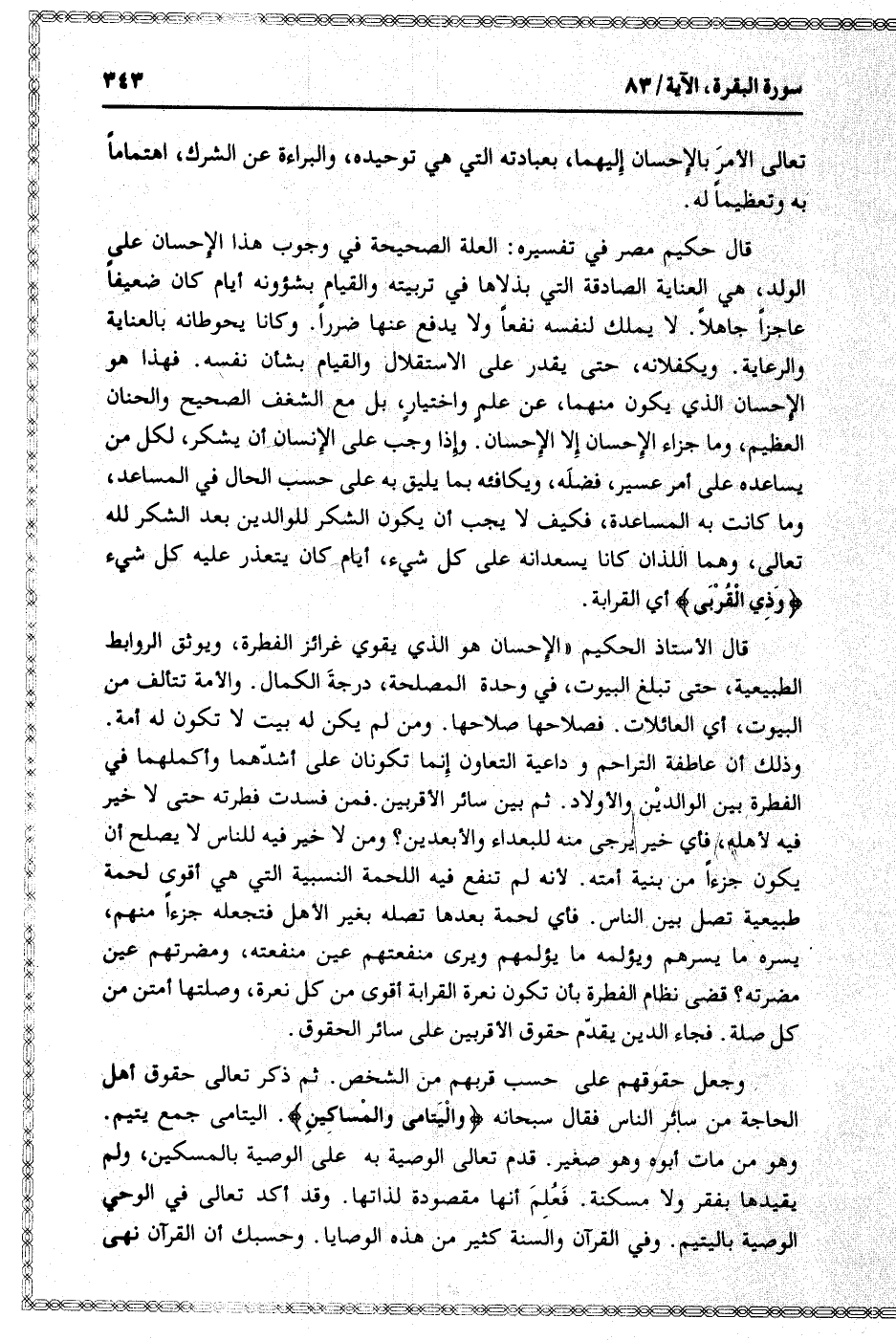 قال حكيم مصر في تفسيره: العلة الصحيحة في وجوب هذا الإحسان على الولد، هي العناية الصادقة التي بذلاها في تربيته والقيام بشئونه أيام كان ضعيفا عاجزا جاهلا. لا يملك لنفسه نفعا ولا يدفع عنها ضررا. وكانا يحوطانه بالعناية والرعاية. ويكفلانه، حتى يقدر على الاستقلال والقيام بشأن نفسه. فهذا هو الإحسان الذي يكون منهما، عن علم واختيار، بل مع الشغف الصحيح والحنان العظيم، وما جزاء الإحسان إلا الإحسان. وإذا وجب على الإنسان أن يشكر، لكل من يساعده على أمر عسير، فضله، ويكافئه بما يليق به على حسب الحال في المساعد، وما كانت به المساعدة، فكيف لا يجب أن يكون الشكر للوالدين بعد الشكر لله تعالى، وهما اللذان كانا يسعدانه على كل شيء، أيام كان يتعذر عليه كل شيء وَذِي الْقُرْبى أي القرابة.