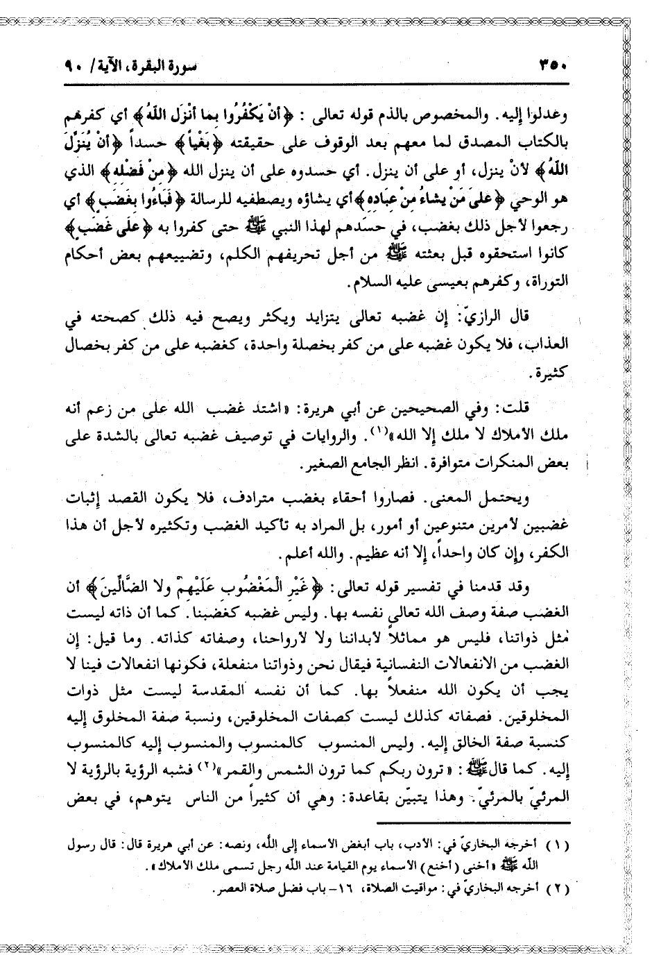 وقد قدمنا في تفسير قوله تعالى: غَيْرِ الْمَغْضُوبِ عَلَيْهِمْ وَلَا الضَّالِّينَ أن الغضب صفة وصف الله تعالى نفسه بها. وليس غضبه كغضبنا. كما أن ذاته ليست مثل ذواتنا، فليس هو مماثلا لأبداننا ولا لأرواحنا، وصفاته كذاته. وما قيل: إن الغضب من الانفعالات النفسانية فيقال نحن وذواتنا منفعلة، فكونها انفعالات فينا لا يجب أن يكون الله منفعلا بها. كما أن نفسه المقدسة ليست مثل ذوات المخلوقين. فصفاته كذلك ليست كصفات المخلوقين، ونسبة صفة المخلوق إليه كنسبة صفة الخالق إليه. وليس المنسوب كالمنسوب والمنسوب إليه كالمنسوب إليه. كما