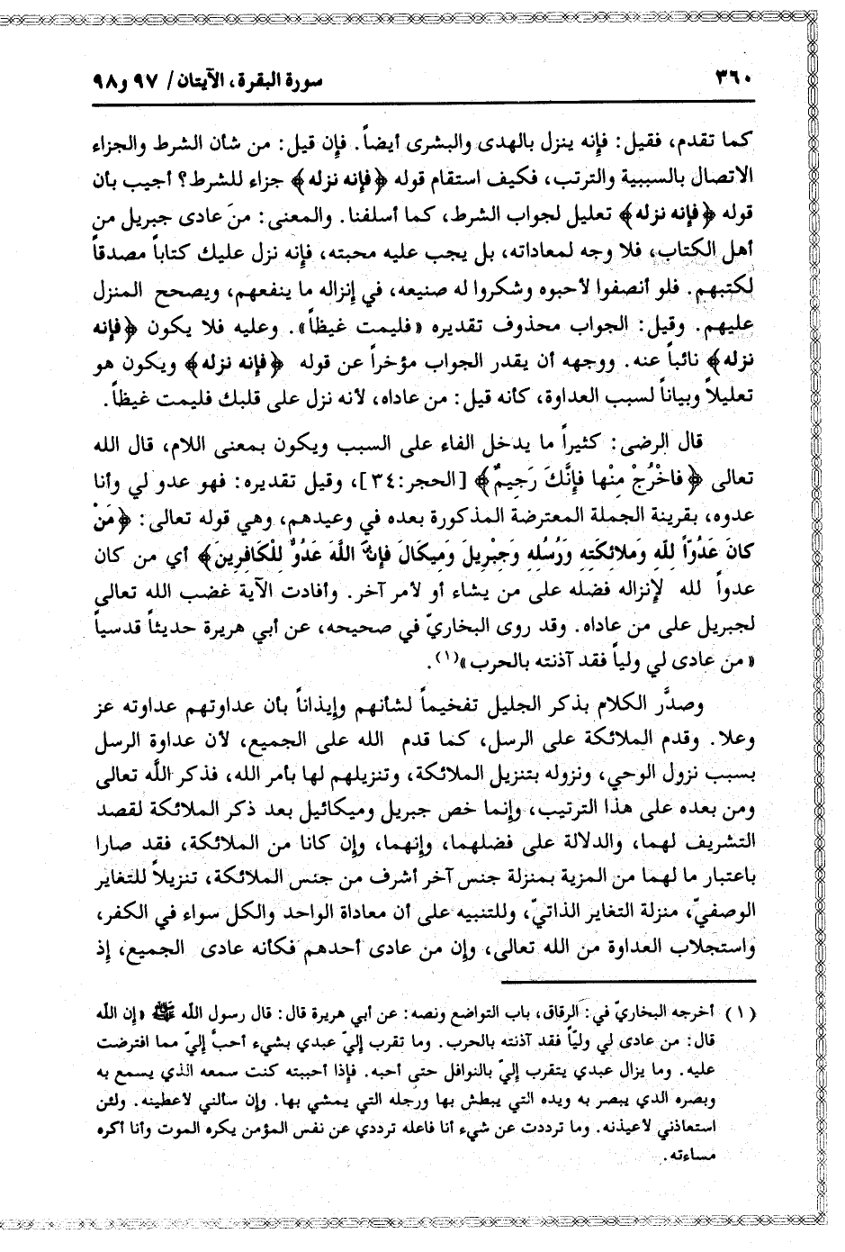 كما تقدم، فقيل: فإنه ينزل بالهدى والبشرى أيضا. فإن قيل: من شأن الشرط والجزاء الاتصال بالسببية والترتب، فكيف استقام قوله فَإِنَّهُ نَزَّلَهُ جزاء للشرط؟ أجيب بأن قوله فَإِنَّهُ نَزَّلَهُ تعليل لجواب الشرط، كما أسلفنا. والمعنى: من عادى جبريل من أهل الكتاب، فلا وجه لمعاداته، بل يجب عليه محبته، فإنه نزل عليك كتابا مصدقا لكتبهم. فلو أنصفوا لأحبوه وشكروا له صنيعه، في إنزاله ما ينفعهم، ويصحح المنزل عليهم. وقيل: الجواب محذوف تقديره «فليمت غيظا» . وعليه فلا يكون فَإِنَّهُ نَزَّلَهُ نائبا عنه. ووجهه أن يقدر الجواب مؤخرا عن قوله فَإِنَّهُ نَزَّلَهُ ويكون هو تعليلا وبيانا لسبب العداوة، كأنه قيل: من عاداه، لأنه نزل على قلبك فليمت غيظا.