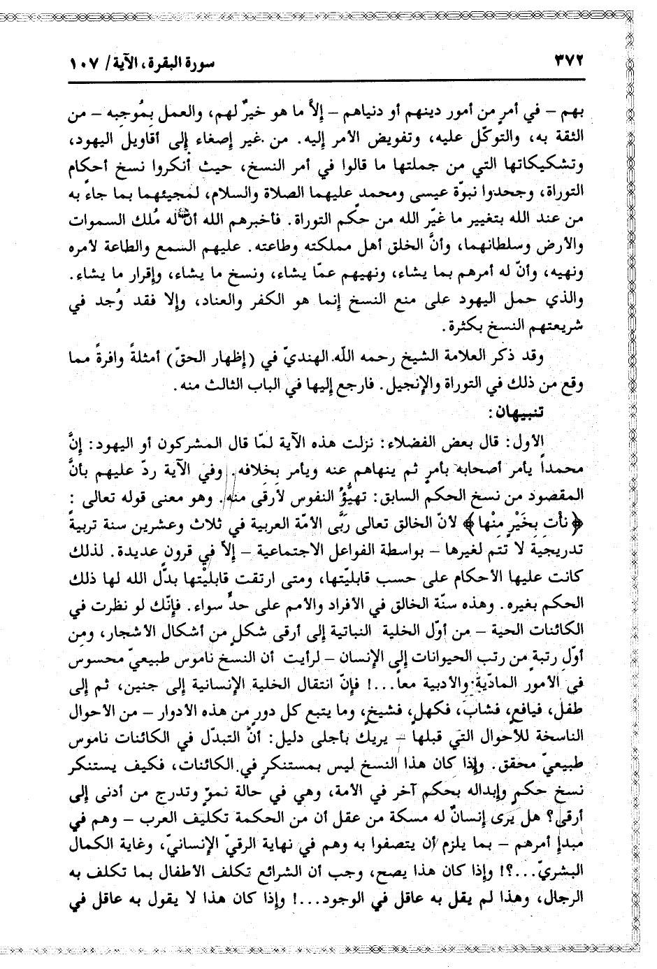 نَأْتِ بِخَيْرٍ مِنْها لأنّ الخالق تعالى ربّى الأمّة العربية في ثلاث وعشرين سنة تربية تدريجية لا تتم لغيرها- بواسطة الفواعل الاجتماعية- إلّا في قرون عديدة. لذلك كانت عليها الأحكام على حسب قابليّتها، ومتى ارتقت قابليتها بدّل الله لها ذلك الحكم بغيره. وهذه سنّة الخالق في الأفراد والأمم على حدّ سواء. فإنّك لو نظرت في الكائنات الحية- من أوّل الخلية النباتية إلى أرقى شكل من أشكال الأشجار، ومن أوّل رتبة من رتب الحيوانات إلى الإنسان- لرأيت أن النسخ ناموس طبيعيّ محسوس في الأمور المادّية. والأدبية معا ... ! فإنّ انتقال الخلية الإنسانية إلى جنين، ثم إلى طفل، فيافع، فشاب، فكهل، فشيخ، وما يتبع كل دور من هذه الأدوار- من الأحوال الناسخة للأحوال التي قبلها- يريك بأجلى دليل: أنّ التبدّل في الكائنات ناموس طبيعيّ محقق. وإذا كان هذا النسخ ليس بمستنكر في الكائنات، فكيف يستنكر نسخ حكم وإبداله بحكم آخر في الأمة، وهي في حالة نمو وتدرج من أدنى إلى أرقى؟ هل يرى إنسان له مسكة من عقل أن من الحكمة تكليف العرب- وهم في مبدإ أمرهم- بما يلزم أن يتصفوا به وهم في نهاية الرقيّ الإنسانيّ، وغاية الكمال البشريّ ... ؟! وإذا كان هذا يصح، وجب أن الشرائع تكلف الأطفال بما تكلف به الرجال، وهذا لم يقل به عاقل في الوجود ... ! وإذا كان هذا لا يقول به عاقل في