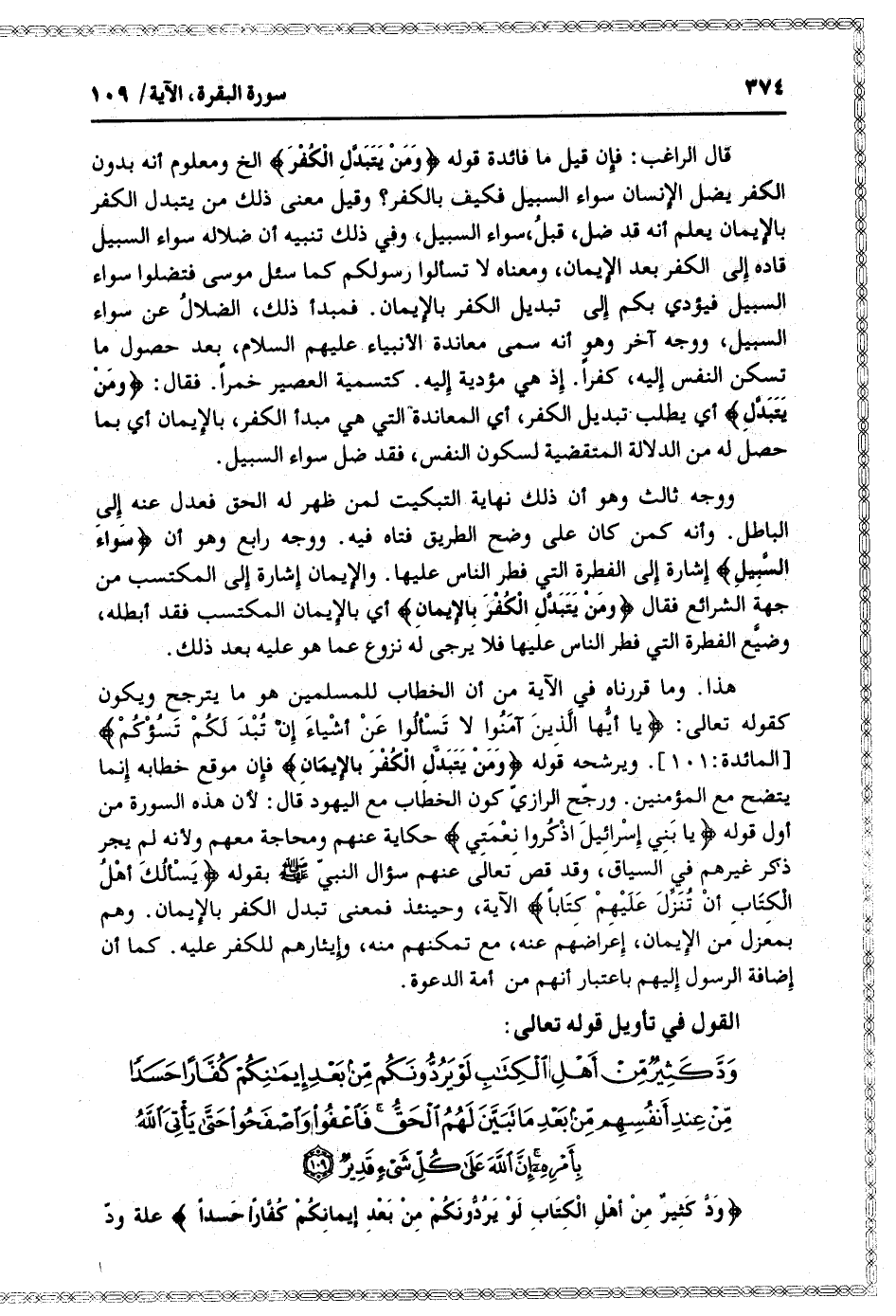 قال الراغب: فإن قيل ما فائدة قوله وَمَنْ يَتَبَدَّلِ الْكُفْرَ إلخ ومعلوم أنه بدون الكفر يضل الإنسان سواء السبيل فكيف بالكفر؟ وقيل معنى ذلك من يتبدل الكفر بالإيمان يعلم أنه قد ضل، قبل، سواء السبيل، وفي ذلك تنبيه أن ضلاله سواء السبيل قاده إلى الكفر بعد الإيمان، ومعناه لا تسألوا رسولكم كما سئل موسى فتضلوا سواء السبيل فيؤدي بكم إلى تبديل الكفر بالإيمان. فمبدأ ذلك، الضلال عن سواء السبيل، ووجه آخر وهو أنه سمى معاندة الأنبياء عليهم السلام، بعد حصول ما تسكن النفس إليه، كفرا. إذ هي مؤدية إليه. كتسمية العصير خمرا. فقال: وَمَنْ يَتَبَدَّلِ أي يطلب تبديل الكفر، أي المعاندة التي هي مبدأ الكفر، بالإيمان أي بما حصل له من الدلالة المقتضية لسكون النفس، فقد ضل سواء السبيل.