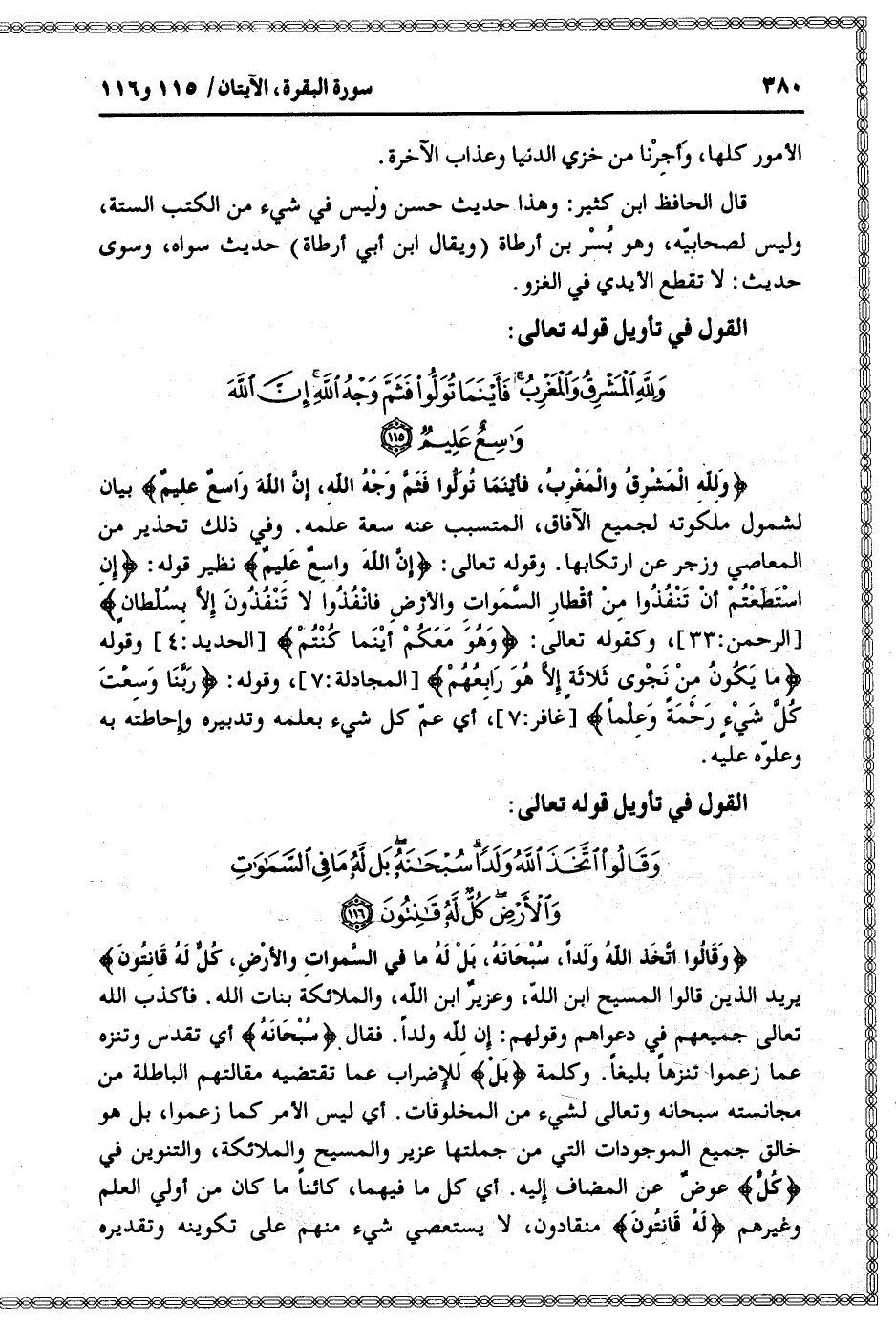 وَلِلَّهِ الْمَشْرِقُ وَالْمَغْرِبُ، فَأَيْنَما تُوَلُّوا فَثَمَّ وَجْهُ اللَّهِ، إِنَّ اللَّهَ واسِعٌ عَلِيمٌ بيان لشمول ملكوته لجميع الآفاق، المتسبب عنه سعة علمه. وفي ذلك تحذير من المعاصي وزجر عن ارتكابها. وقوله تعالى: إِنَّ اللَّهَ واسِعٌ عَلِيمٌ نظير قوله: إِنِ اسْتَطَعْتُمْ أَنْ تَنْفُذُوا مِنْ أَقْطارِ السَّماواتِ وَالْأَرْضِ فَانْفُذُوا لا تَنْفُذُونَ إِلَّا بِسُلْطانٍ [الرحمن: 33] ، وكقوله تعالى: وَهُوَ مَعَكُمْ أَيْنَ ما كُنْتُمْ [الحديد: 4] وقوله ما يَكُونُ مِنْ نَجْوى ثَلاثَةٍ إِلَّا هُوَ رابِعُهُمْ [المجادلة: 7] ، وقوله: رَبَّنا وَسِعْتَ كُلَّ شَيْءٍ رَحْمَةً وَعِلْماً [غافر: 7] ، أي عمّ كل شيء بعلمه وتدبيره وإحاطته به وعلوّه عليه.