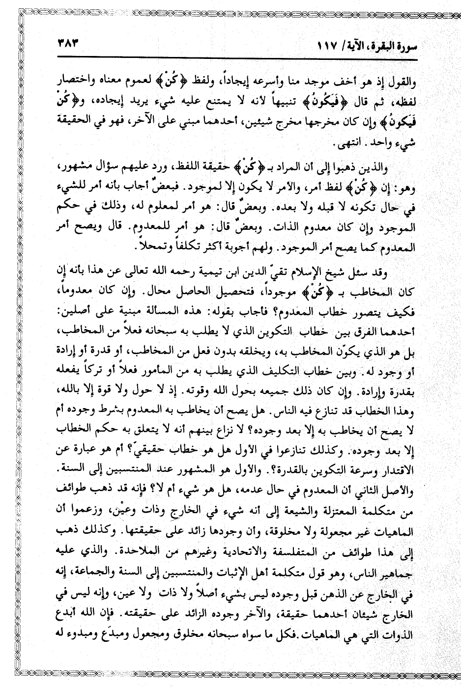 وقد سئل شيخ الإسلام تقيّ الدين ابن تيمية رحمه الله تعالى عن هذا بأنه إن كان المخاطب ب كُنْ موجودا، فتحصيل الحاصل محال. وإن كان معدوما، فكيف يتصور خطاب المعدوم؟ فأجاب بقوله: هذه المسألة مبنية على أصلين: