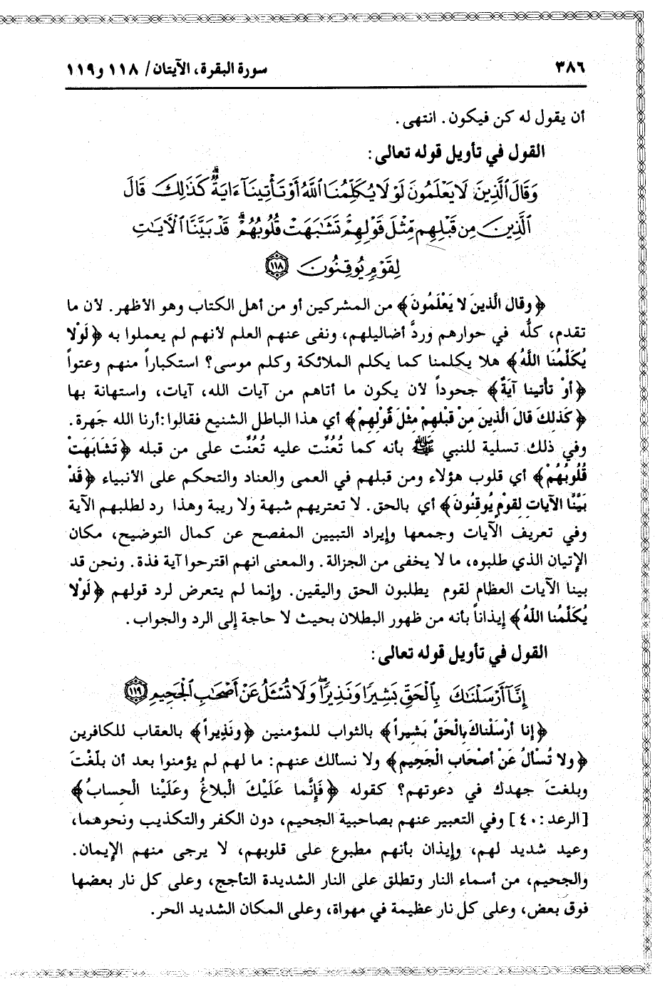 إِنَّا أَرْسَلْناكَ بِالْحَقِّ بَشِيراً وَنَذِيراً وَلا تُسْئَلُ عَنْ أَصْحابِ الْجَحِيمِ (119)