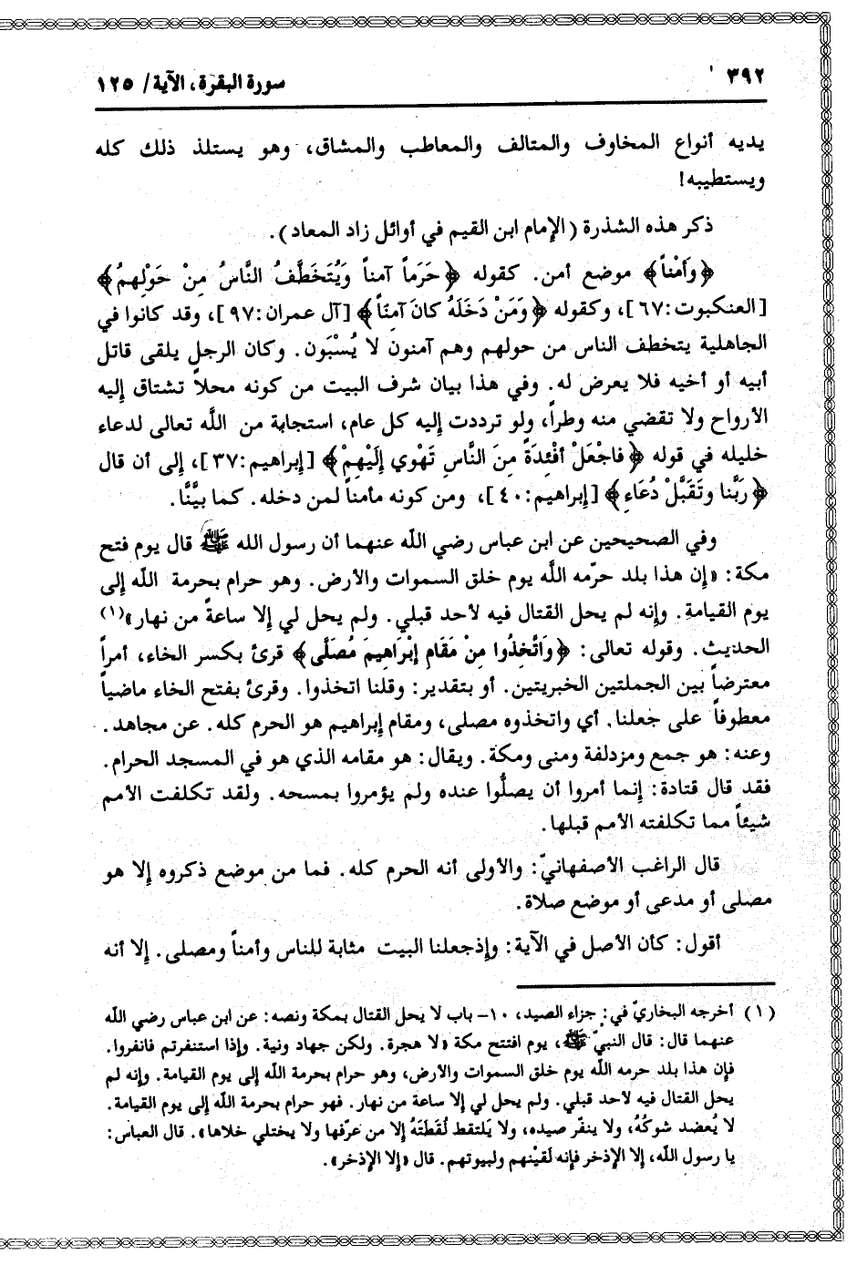 الحديث. وقوله تعالى: وَاتَّخِذُوا مِنْ مَقامِ إِبْراهِيمَ مُصَلًّى قرئ بكسر الخاء، أمرا معترضا بين الجملتين الخبريتين. أو بتقدير: وقلنا اتخذوا. وقرئ بفتح الخاء ماضيا معطوفا على جعلنا. أي واتخذوه مصلى، ومقام إبراهيم هو الحرم كله. عن مجاهد.