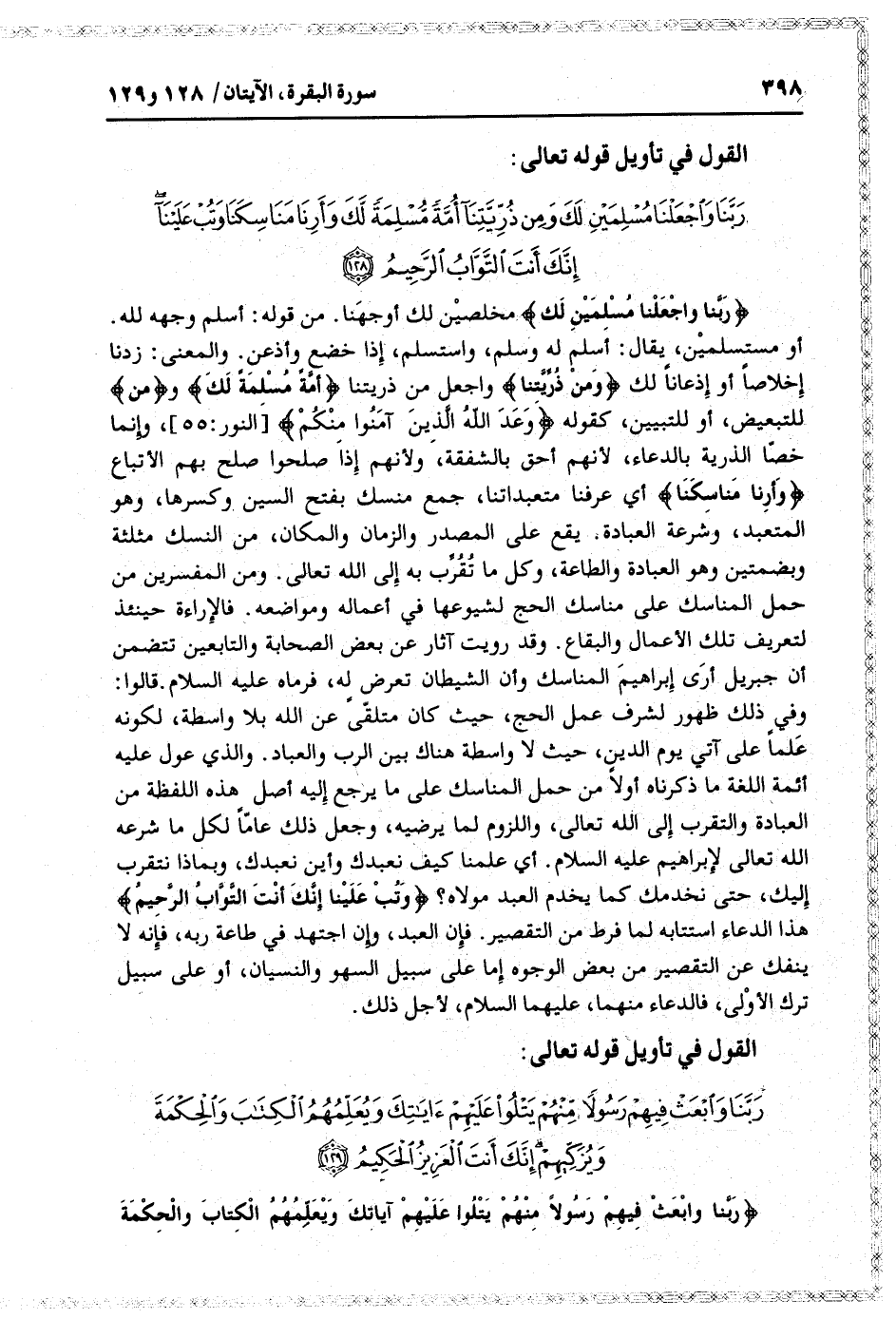 رَبَّنا وَاجْعَلْنا مُسْلِمَيْنِ لَكَ وَمِنْ ذُرِّيَّتِنا أُمَّةً مُسْلِمَةً لَكَ وَأَرِنا مَناسِكَنا وَتُبْ عَلَيْنا إِنَّكَ أَنْتَ التَّوَّابُ الرَّحِيمُ (128)