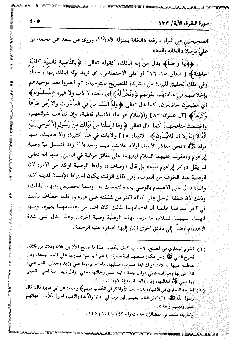 وقد اشتمل نبأ وصية إبراهيم ويعقوب عليهما السلام لبنيهما على دقائق مرغبة في الدين. منها أنه تعالى لم يقل «وأمر إبراهيم بنيه» بل قال «وصاهم» ، ولفظ الوصية أوكد من الأمر، لأن الوصية عند الخوف من الموت، وفي ذلك الوقت يكون احتياط الإنسان لدينه أشد وأتم، فدل على الاهتمام بالوصي به، والتمسك به. ومنها تخصيص بنيهما بذلك، وذلك لأن شفقة الرجل على أبنائه أكثر من شفقته على غيرهم، فلما خصّاهم بذلك في آخر عمرهما علمنا أن اهتمامهما بذلك كان أشد من اهتمامهما بغيره. ومنها أنهما، عليهما السلام، ما مزجا بهذه الوصية وصية أخرى. وهذا يدل على شدة الاهتمام أيضا. إلى دقائق أخرى أشار إليها الفخر، عليه الرحمة.