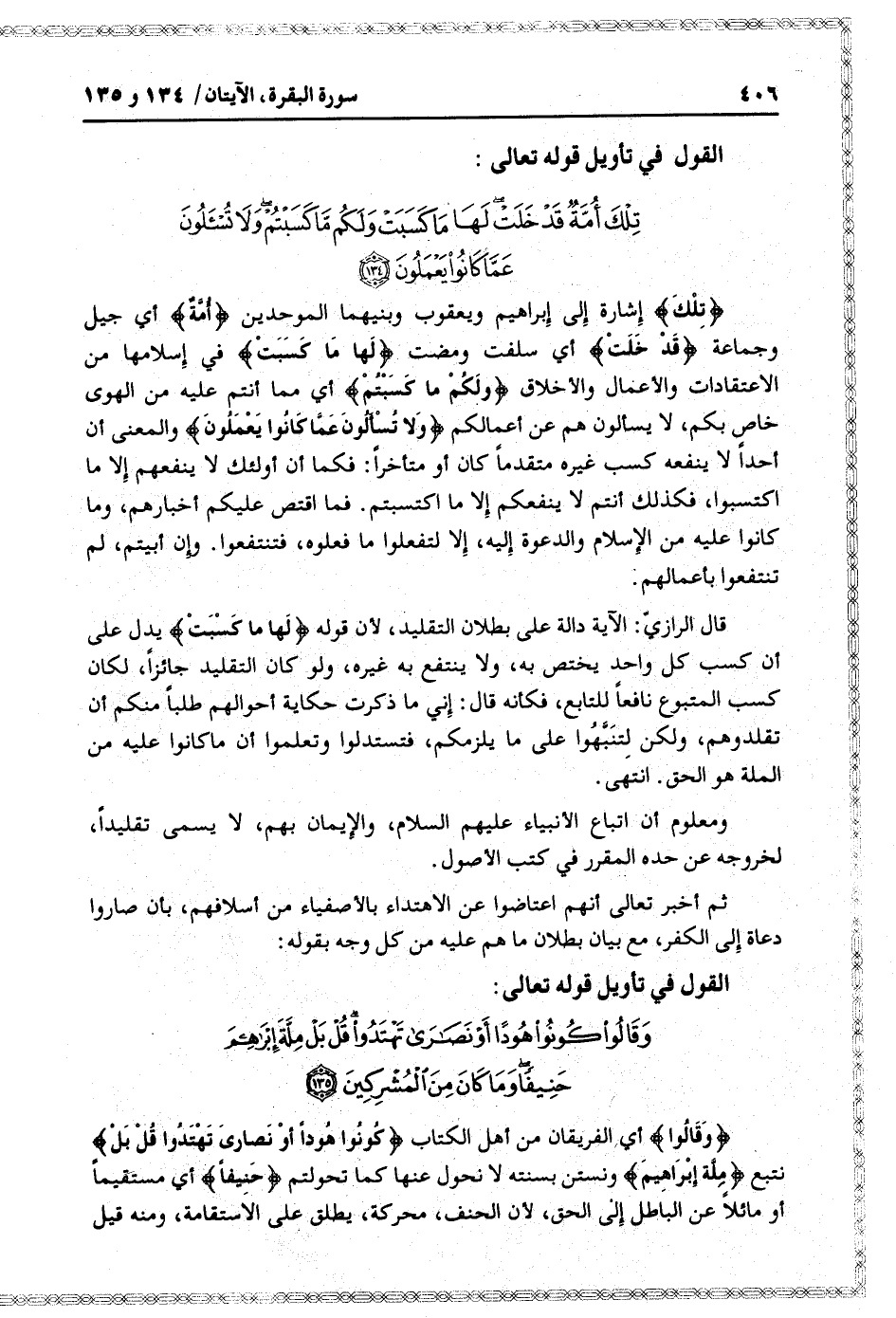 قال الرازيّ: الآية دالة على بطلان التقليد، لأن قوله لَها ما كَسَبَتْ يدل على أن كسب كل واحد يختص به، ولا ينتفع به غيره، ولو كان التقليد جائزا، لكان كسب المتبوع نافعا للتابع، فكأنه قال: إني ما ذكرت حكاية أحوالهم طلبا منكم أن تقلدوهم، ولكن لتنبّهوا على ما يلزمكم، فتستدلوا وتعلموا أن ما كانوا عليه من الملة هو الحق. انتهى.