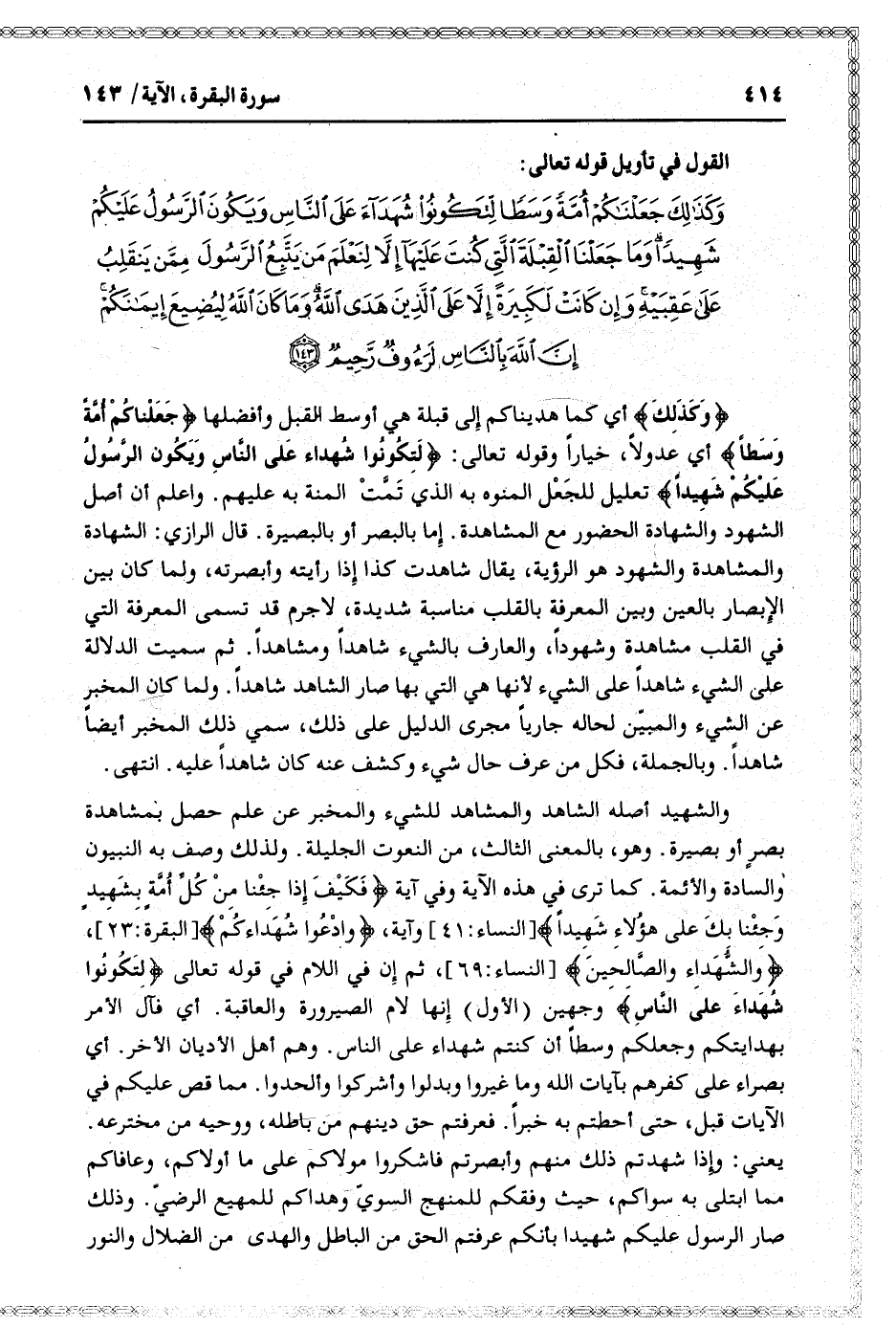 وَكَذلِكَ جَعَلْناكُمْ أُمَّةً وَسَطاً لِتَكُونُوا شُهَداءَ عَلَى النَّاسِ وَيَكُونَ الرَّسُولُ عَلَيْكُمْ شَهِيداً وَما جَعَلْنَا الْقِبْلَةَ الَّتِي كُنْتَ عَلَيْها إِلاَّ لِنَعْلَمَ مَنْ يَتَّبِعُ الرَّسُولَ مِمَّنْ يَنْقَلِبُ عَلى عَقِبَيْهِ وَإِنْ كانَتْ لَكَبِيرَةً إِلاَّ عَلَى الَّذِينَ هَدَى اللَّهُ وَما كانَ اللَّهُ لِيُضِيعَ إِيمانَكُمْ إِنَّ اللَّهَ بِالنَّاسِ لَرَؤُفٌ رَحِيمٌ (143)
