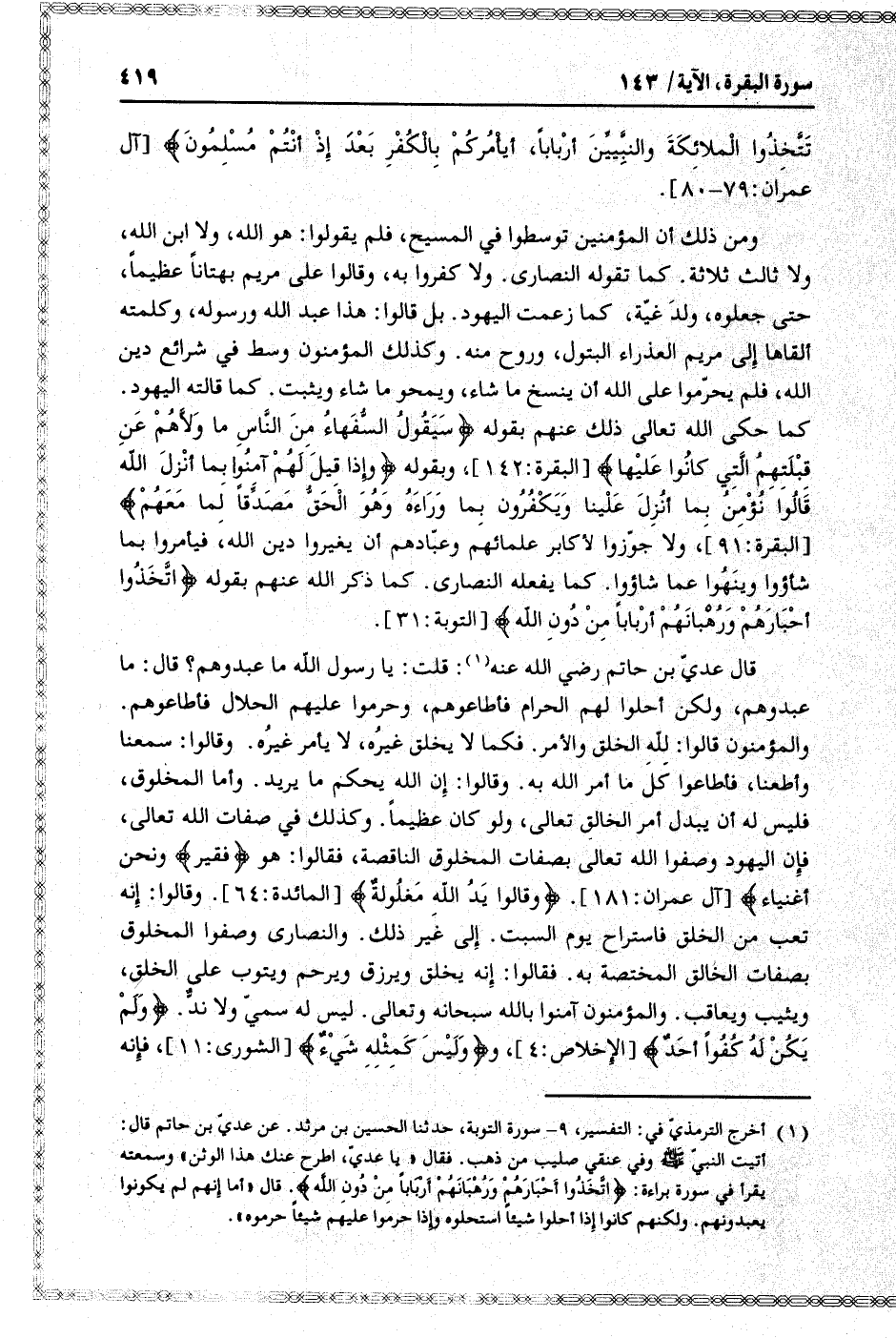 أخرج الترمذيّ في: التفسير، 9- سورة التوبة، حدثنا الحسين بن مرثد. عن عديّ بن حاتم قال: أتيت النبيّ صلّى الله عليه وسلّم وفي عنقي صليب من ذهب. فقال «يا عديّ، اطرح عنك هذا الوثن» وسمعته يقرأ في سورة براءة: اتَّخَذُوا أَحْبارَهُمْ وَرُهْبانَهُمْ أَرْباباً مِنْ دُونِ اللَّهِ. قال «أما إنهم لم يكونوا يعبدونهم. ولكنهم كانوا إذا أحلوا شيئا استحلوه وإذا حرموا عليهم شيئا حرموه»