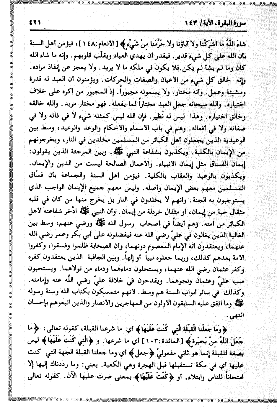 وكذلك في سائر أبواب السنة هم وسط. لأنهم متمسكون بكتاب الله وسنة رسوله صلّى الله عليه وسلّم وما اتفق عليه السابقون الأولون من المهاجرين والأنصار والذين اتبعوهم بإحسان انتهى.