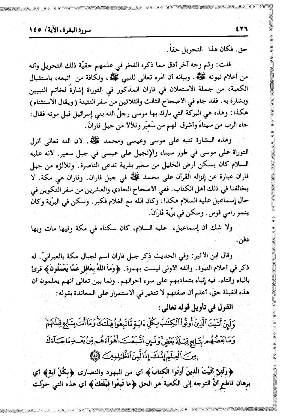 قلت: وثم وجه آخر أدق مما ذكره الفخر في علمهم حقيّة ذلك التحويل وأنه من أعلام نبوته صلّى الله عليه وسلّم. وبيانه أن أمره تعالى للنبيّ صلّى الله عليه وسلّم، ولكافة من اتبعه، باستقبال الكعبة، من جملة الاستعلان في فاران المذكور في التوراة إشارة لخاتم النبيين وبشارة به. فقد جاء في الأصحاح الثالث والثلاثين من سفر التثنية (ويقال الاستثناء) هكذا: وهذه هي البركة التي بارك بها موسى رجل الله بني إسرائيل قبل موته فقال:
