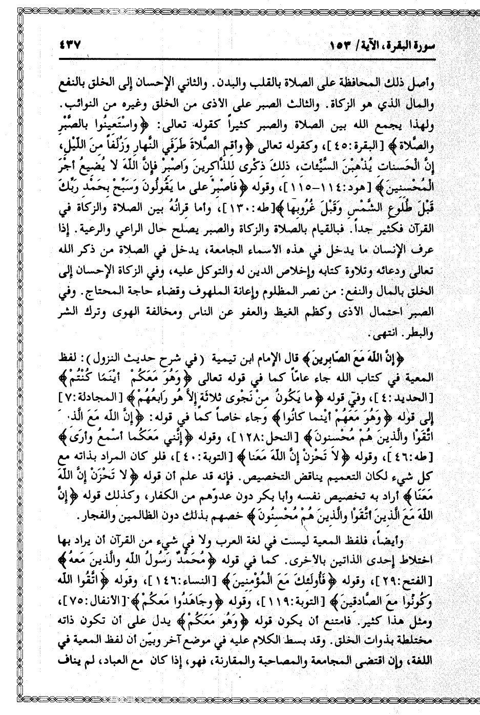 إِنَّ اللَّهَ مَعَ الصَّابِرِينَ قال الإمام ابن تيمية (في شرح حديث النزول) : لفظ المعية في كتاب الله جاء عامّا كما في قوله تعالى وَهُوَ مَعَكُمْ أَيْنَ ما كُنْتُمْ [الحديد: 4] ، وفي قوله ما يَكُونُ مِنْ نَجْوى ثَلاثَةٍ إِلَّا هُوَ رابِعُهُمْ [المجادلة: 7] إلى قوله هُوَ مَعَهُمْ أَيْنَ ما كانُوا وجاء خاصا كما في قوله: إِنَّ اللَّهَ مَعَ الَّذِينَ اتَّقَوْا وَالَّذِينَ هُمْ مُحْسِنُونَ [النحل: 128] ، وقوله إِنَّنِي مَعَكُما أَسْمَعُ وَأَرى [طه: 46] ، وقوله لا تَحْزَنْ إِنَّ اللَّهَ مَعَنا [التوبة: 40] ، فلو كان المراد بذاته مع كل شيء لكان التعميم يناقض التخصيص. فإنه قد علم أن قوله لا تَحْزَنْ إِنَّ اللَّهَ مَعَنا أراد به تخصيص نفسه وأبا بكر دون عدوّهم من الكفار، وكذلك قوله إِنَّ اللَّهَ مَعَ الَّذِينَ اتَّقَوْا وَالَّذِينَ هُمْ مُحْسِنُونَ خصهم بذلك دون الظالمين والفجار.