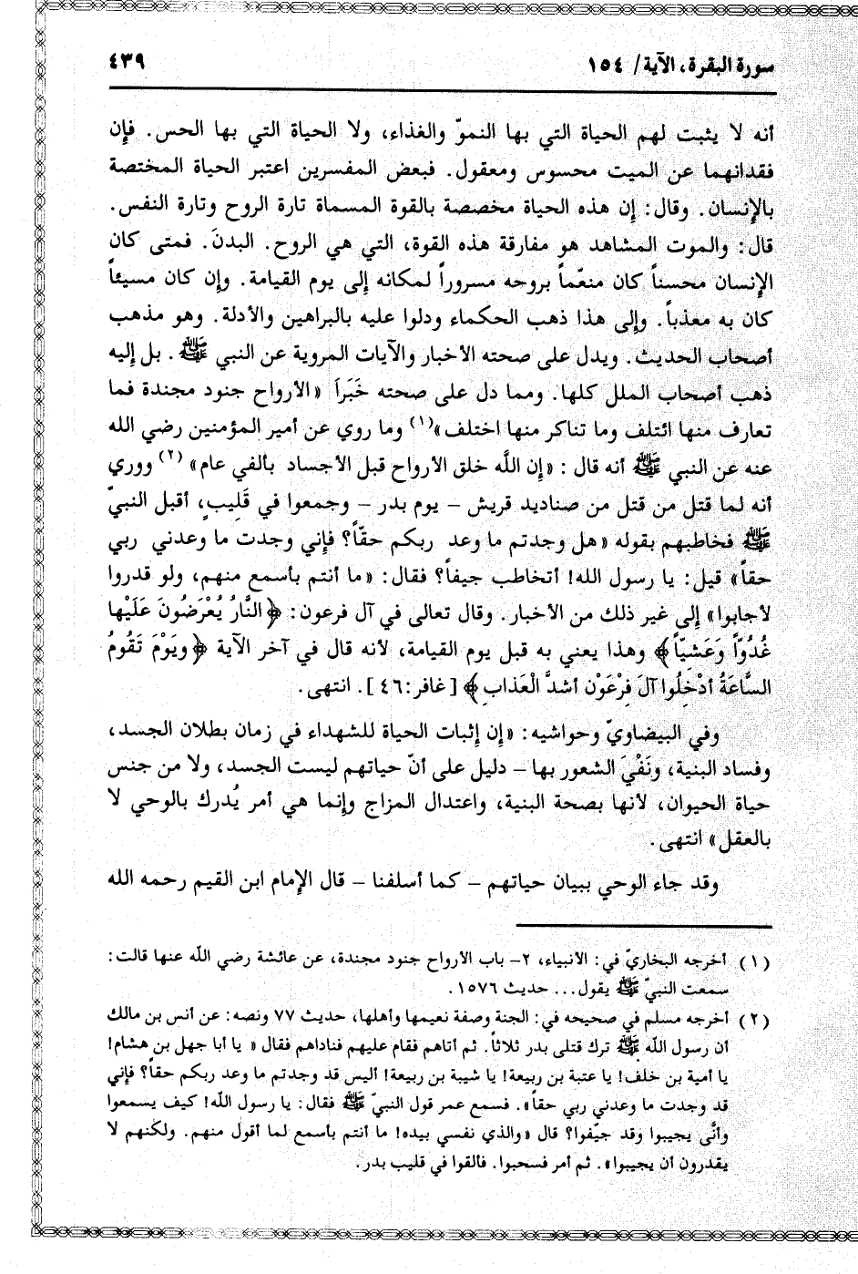 وفي البيضاويّ وحواشيه: «إن إثبات الحياة للشهداء في زمان بطلان الجسد، وفساد البنية، ونفي الشعور بها- دليل على أنّ حياتهم ليست الجسد، ولا من جنس حياة الحيوان، لأنها بصحة البنية، واعتدال المزاج وإنما هي أمر يدرك بالوحي لا بالعقل» انتهى.