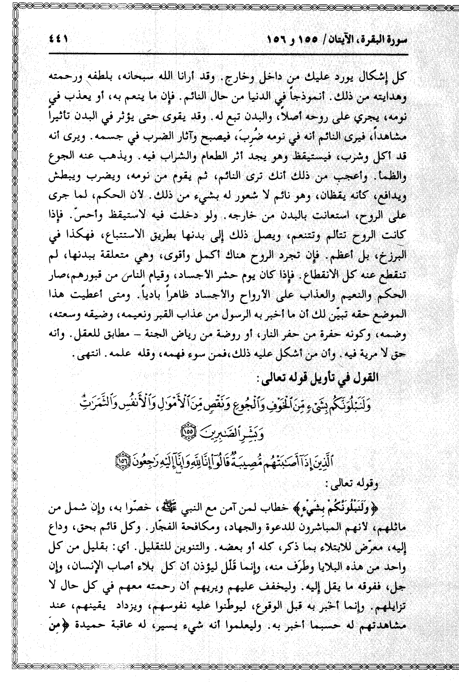 وَلَنَبْلُوَنَّكُمْ بِشَيْءٍ مِنَ الْخَوْفِ وَالْجُوعِ وَنَقْصٍ مِنَ الْأَمْوالِ وَالْأَنْفُسِ وَالثَّمَراتِ وَبَشِّرِ الصَّابِرِينَ (155) الَّذِينَ إِذا أَصابَتْهُمْ مُصِيبَةٌ قالُوا إِنَّا لِلَّهِ وَإِنَّا إِلَيْهِ راجِعُونَ (156)