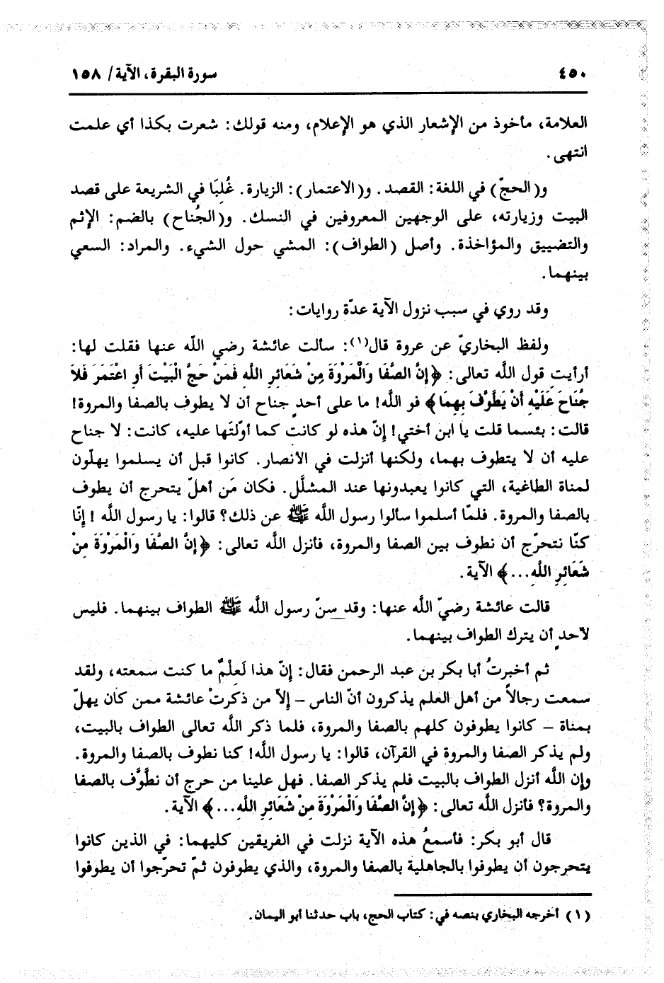 أرأيت قول الله تعالى: إِنَّ الصَّفا وَالْمَرْوَةَ مِنْ شَعائِرِ اللَّهِ فَمَنْ حَجَّ الْبَيْتَ أَوِ اعْتَمَرَ فَلا جُناحَ عَلَيْهِ أَنْ يَطَّوَّفَ بِهِما فو الله! ما على أحد جناح أن لا يطوف بالصفا والمروة! قالت: بئسما قلت يا ابن أختي! إنّ هذه لو كانت كما أوّلتها عليه، كانت: لا جناح عليه أن لا يتطوف بهما، ولكنها أنزلت في الأنصار. كانوا قبل أن يسلموا يهلّون لمناة الطاغية، التي كانوا يعبدونها عند المشلّل. فكان من أهلّ يتحرج أن يطوف بالصفا والمروة. فلمّا أسلموا سألوا رسول الله صلّى الله عليه وسلّم عن ذلك؟ قالوا: يا رسول الله! إنّا كنّا نتحرّج أن نطوف بين الصفا والمروة، فأنزل الله تعالى: إِنَّ الصَّفا وَالْمَرْوَةَ مِنْ شَعائِرِ اللَّهِ ... الآية.