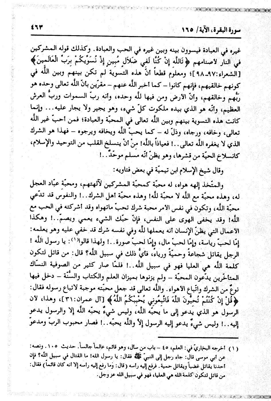 غيره في العبادة فيسوون بينه وبين غيره في الحب والعبادة. وكذلك قوله المشركين في النار لأصنامهم تَاللَّهِ إِنْ كُنَّا لَفِي ضَلالٍ مُبِينٍ إِذْ نُسَوِّيكُمْ بِرَبِّ الْعالَمِينَ [الشعراء: 97- 98] ومعلوم قطعا أنّ هذه التسوية لم تكن بينهم وبين الله في كونهم خالقيهم، فإنهم كانوا- كما أخبر الله عنهم- مقرّين بأنّ الله تعالى وحده هو ربّهم وخالقهم، وأنّ الأرض ومن فيها لله وحده، وأنه ربّ السموات وربّ العرش العظيم، وأنّه هو الذي بيده ملكوت كلّ شيء، وهو يجير ولا يجار عليه ... وإنما كانت هذه التسوية بينهم وبين الله تعالى في المحبّة والعبادة فمن أحبّ غير الله تعالى، وخافه، ورجاه، وذلّ له- كما يحبّ الله ويخافه ويرجوه- فهذا هو الشرك الذي لا يغفره الله تعالى..! فعياذا بالله! من أن ينسلخ القلب من التوحيد والإسلام، كانسلاخ الحيّة من قشرها، وهو يظنّ أنّه مسلم موحّد..!