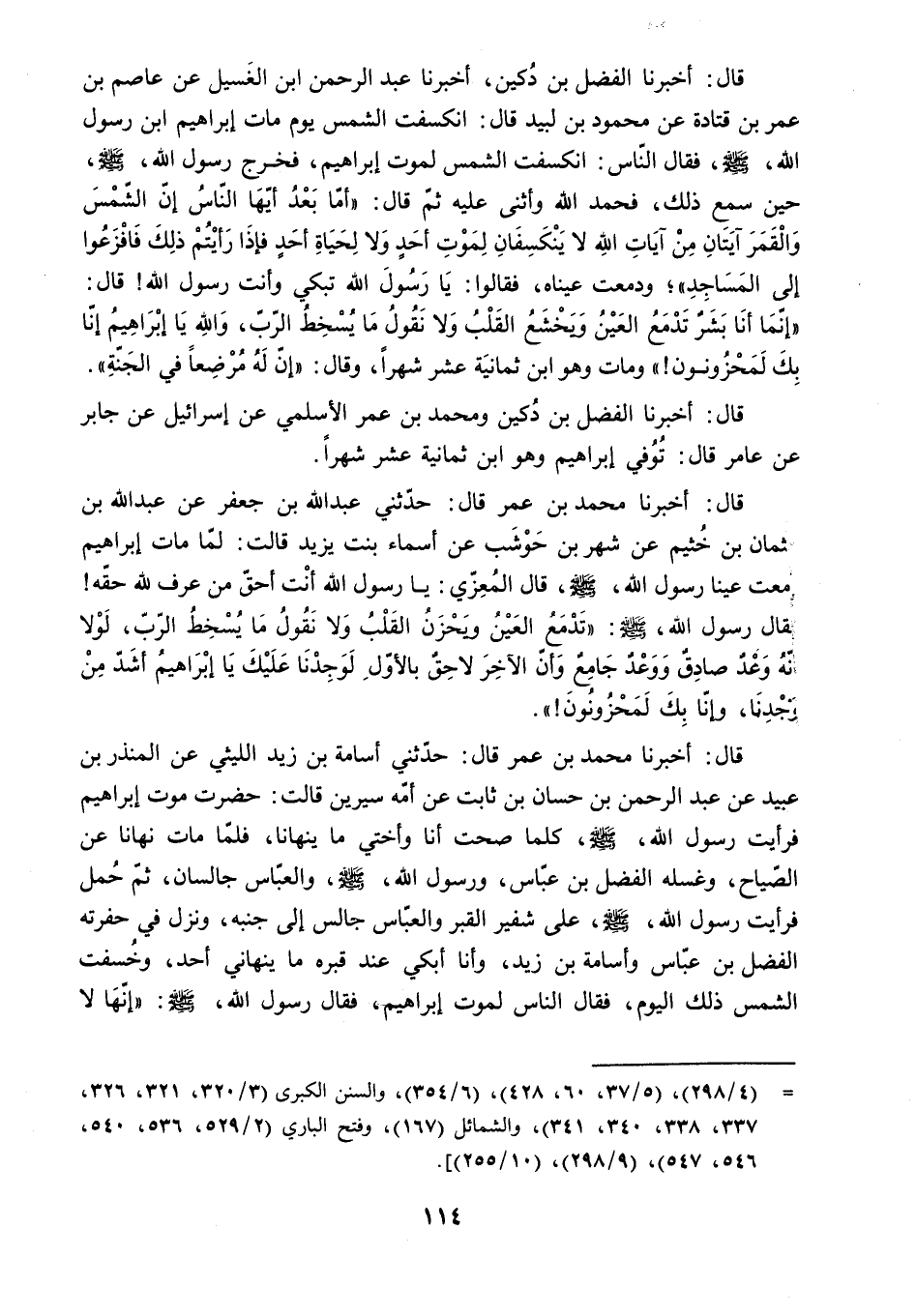 قَالَ: أَخْبَرَنَا مُحَمَّدُ بْنُ عُمَرَ قَالَ: حَدَّثَنِي أُسَامَةُ بْنُ زَيْدٍ اللَّيْثِيُّ عَنِ الْمُنْذِرِ بْنِ عُبَيْدٍ عَنْ عَبْدِ الرَّحْمَنِ بْنِ حَسَّانَ بْنِ ثَابِتٍ عَنْ أُمِّهِ سِيرِينَ قَالَتْ: حَضَرْتُ مَوْتَ إِبْرَاهِيمَ فَرَأَيْتُ رَسُولَ اللَّهِ - صَلَّى اللَّهُ عَلَيْهِ وَسَلَّمَ - كُلَّمَا صِحْتُ أَنَا وَأُخْتِي مَا يَنْهَانَا. فَلَمَّا مَاتَ نَهَانَا عَنِ الصِّيَاحِ. وَغَسَّلَهُ الْفَضْلُ بْنُ عَبَّاسٍ. وَرَسُولُ اللَّهِ - صَلَّى اللَّهُ عليه وسلم - والعباس جالسان. ثم فَرَأَيْتُ رَسُولَ اللَّهِ - صَلَّى اللَّهُ عَلَيْهِ وَسَلَّمَ - عَلَى شَفِيرِ الْقَبْرِ وَالْعَبَّاسُ جَالِسٌ إِلَى جَنْبِهِ. وَنَزَلَ فِي حُفْرَتِهِ الْفَضْلُ بْنُ عَبَّاسٍ وَأُسَامَةُ بْنُ زَيْدٍ. وَأَنَا أَبْكِي عِنْدَ قَبْرِهِ مَا يَنْهَانِي أَحَدٌ. وَخَسَفَتِ الشَّمْسُ ذَلِكَ الْيَوْمَ. فَقَالَ النَّاسُ لِمَوْتِ إِبْرَاهِيمَ. [فَقَالَ رَسُولُ اللَّهِ. ص: إنها لا
