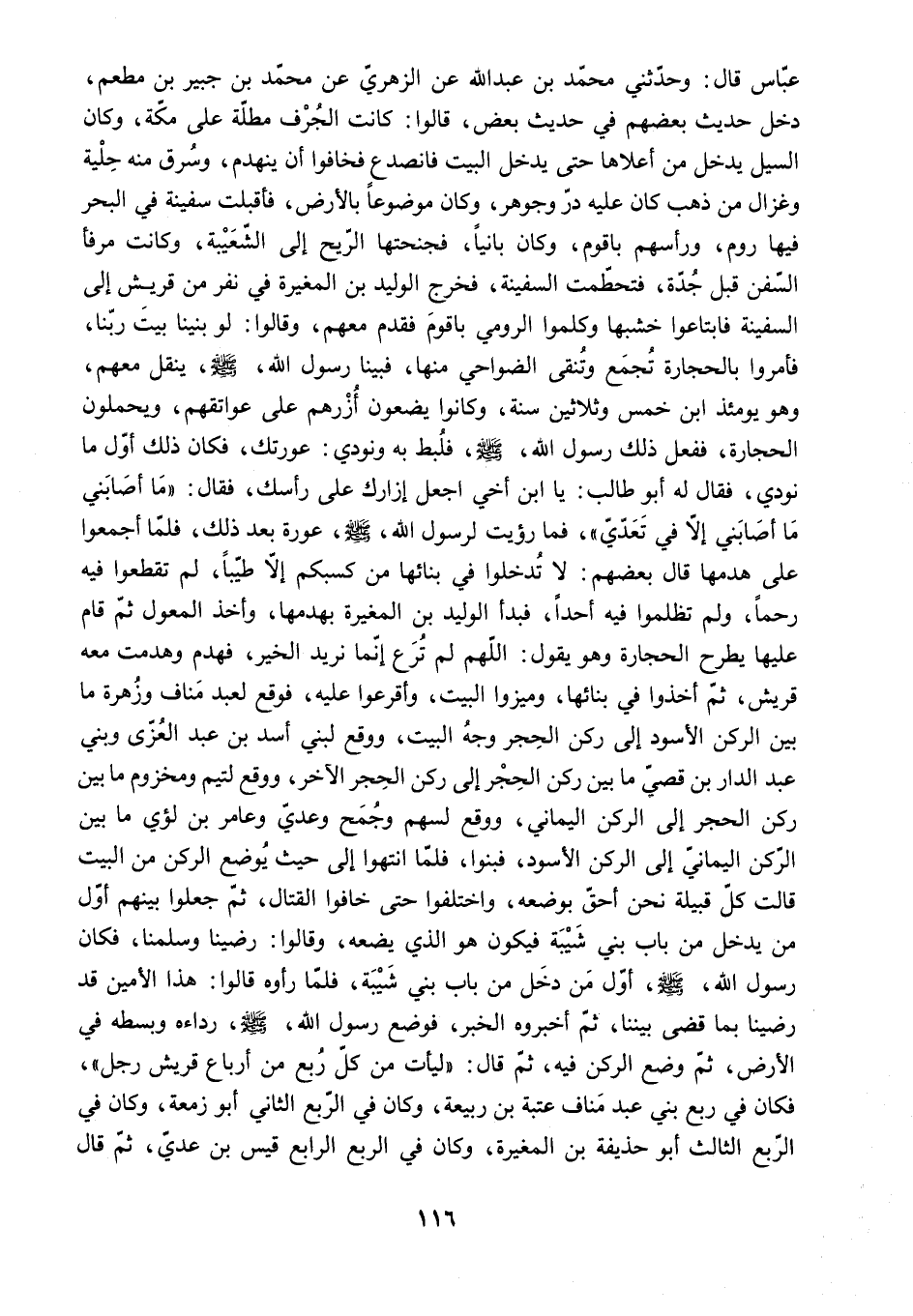 وَهُوَ يَوْمَئِذٍ ابْنُ خَمْسٍ وَثَلاثِينَ سَنَةً. وَكَانُوا يَضَعُونَ أُزْرَهُمْ عَلَى عَوَاتِقِهِمْ. وَيَحْمِلُونَ الْحِجَارَةَ. فَفَعَلَ ذَلِكَ رَسُولُ اللَّهِ - صَلَّى اللَّهُ عَلَيْهِ وَسَلَّمَ - فَلُبِطَ بِهِ وَنُودِيَ: عَوْرَتُكَ. فَكَانَ ذَلِكَ أَوَّلَ مَا نُودِيَ. فَقَالَ لَهُ أَبُو طَالِبٍ: يَا ابْنَ أَخِي اجْعَلْ إِزَارَكَ عَلَى رَأْسِكَ. [فَقَالَ: مَا أَصَابَنِي ما أصابني إلا في تعدي] . فما رؤيت لِرَسُولِ اللَّهِ - صَلَّى اللَّهُ عَلَيْهِ وَسَلَّمَ - عَوْرَةٌ بَعْدَ ذَلِكَ. فَلَمَّا أَجْمَعُوا عَلَى هَدْمِهَا قَالَ بَعْضُهُمْ: لا تُدْخِلُوا فِي بِنَائِهَا مِنْ كَسْبِكُمْ إِلا طَيِّبًا. لَمْ تَقْطَعُوا فِيهِ رَحِمًا. وَلَمْ تَظْلِمُوا فِيهِ أَحَدًا. فَبَدَأَ الْوَلِيدُ بْنُ الْمُغِيرَةِ بِهَدْمِهَا. وَأَخَذَ الْمِعْوَلَ ثُمَّ قَامَ عَلَيْهَا يَطْرَحُ الْحِجَارَةَ وَهُوَ يَقُولُ: اللَّهُمَّ لَمْ تُرَعْ إِنَّمَا نُرِيدُ الْخَيْرَ. فَهَدَمَ وَهَدَمَتْ مَعَهُ قُرَيْشٌ. ثُمَّ أَخَذُوا فِي بِنَائِهَا. وَمَيَّزُوا الْبَيْتَ. وَأَقْرَعُوا عَلَيْهِ. فَوَقَعَ لِعَبْدِ مَنَافٍ وَزُهْرَةَ مَا بَيْنَ الرُّكْنِ الأَسْوَدِ إِلَى رُكْنِ الْحِجْرِ وَجْهُ الْبَيْتِ. وَوَقَعَ لِبَنِي أَسَدِ بْنِ عَبْدِ الْعُزَّى وَبَنِي عَبْدِ الدَّارِ بْنِ قُصَيٍّ مَا بَيْنَ رُكْنِ الْحِجْرِ إِلَى رُكْنِ الْحِجْرِ الآخَرِ. وَوَقَعَ لِتَيْمٍ وَمَخْزُومٍ مَا بَيْنَ رُكْنِ الْحِجْرِ إِلَى الرُّكْنِ الْيَمَانِيِّ. وَوَقَعَ لِسَهْمٍ وَجُمَحٍ وَعَدِيٍّ وَعَامِرِ بْنِ لُؤَيٍّ مَا بَيْنَ الرُّكْنِ الْيَمَانِيِّ إِلَى الرُّكْنِ الأَسْوَدِ. فَبَنَوْا. فَلَمَّا انْتَهَوْا إِلَى حَيْثُ يُوضَعُ الرُّكْنُ مِنَ الْبَيْتِ قَالَتْ كُلُّ قَبِيلَةٍ نَحْنُ أَحَقُّ بِوَضْعِهِ. وَاخْتَلَفُوا حَتَّى خَافُوا الْقِتَالَ. ثُمَّ جَعَلُوا بَيْنَهُمْ أَوَّلَ مَنْ يَدْخُلُ مِنْ بَابِ بَنِي شَيْبَةَ فَيَكُونُ هُوَ الَّذِي يَضَعُهُ. وَقَالُوا: رَضِينَا وَسَلَّمْنَا. فَكَانَ رَسُولُ اللَّهِ - صَلَّى اللَّهُ عَلَيْهِ وَسَلَّمَ - أَوَّلَ مَنْ دَخَلَ مِنْ بَابِ بَنِي شَيْبَةَ. فَلَمَّا رَأَوْهُ قَالُوا: هَذَا الأَمِينُ قَدْ رَضِينَا بِمَا قَضَى بَيْنَنَا. ثُمَّ أَخْبَرُوهُ الْخَبَرَ. فَوَضَعَ رَسُولُ اللَّهِ - صَلَّى اللَّهُ عَلَيْهِ وَسَلَّمَ - رِدَاءَهُ وَبَسَطَهُ فِي الأَرْضِ. ثُمَّ وَضَعَ الرُّكْنَ فِيهِ. [ثُمَّ قَالَ: لِيَأْتِ مِنْ كُلِّ رُبُعٍ مِنْ أَرْبَاعِ قُرَيْشٍ رَجُلٌ] .