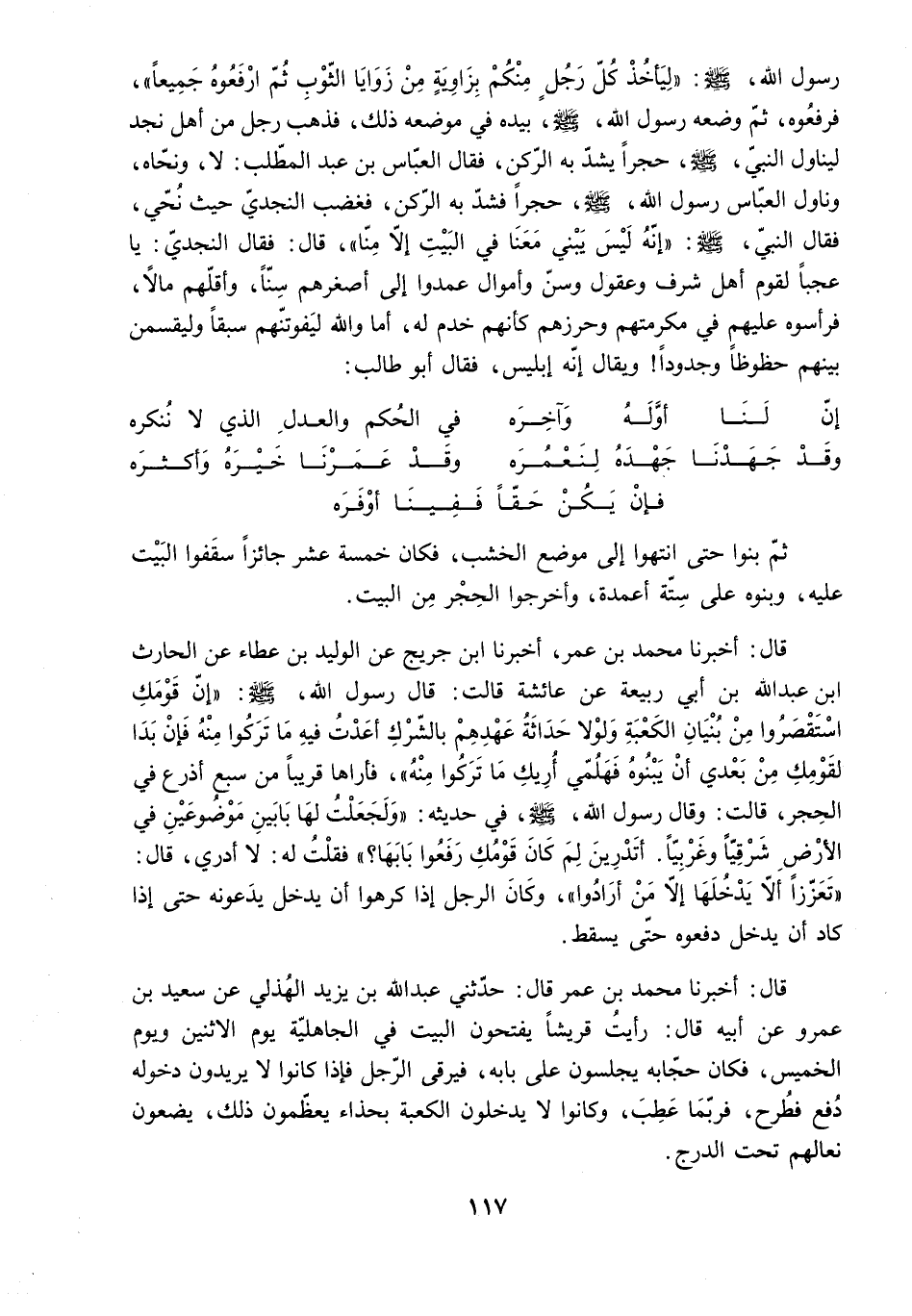 فَرَفَعُوهُ. ثُمَّ وَضَعَهُ رَسُولُ اللَّهِ - صَلَّى اللَّهُ عَلَيْهِ وَسَلَّمَ - بِيَدِهِ فِي مَوْضِعِهِ ذَلِكَ. فَذَهَبَ رَجُلٌ مِنْ أَهْلِ نَجْدٍ لِيُنَاوِلَ النَّبِيَّ - صَلَّى اللَّهُ عَلَيْهِ وَسَلَّمَ - حَجَرًا يَشُدُّ بِهِ الرُّكْنَ. فَقَالَ الْعَبَّاسُ بْنُ عَبْدِ الْمُطَّلِبِ: لا. وَنَحَّاهُ.